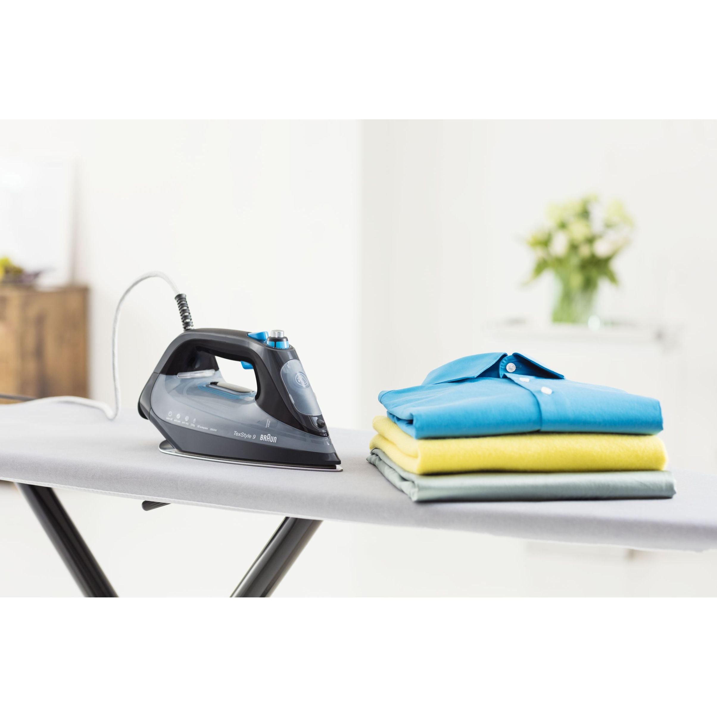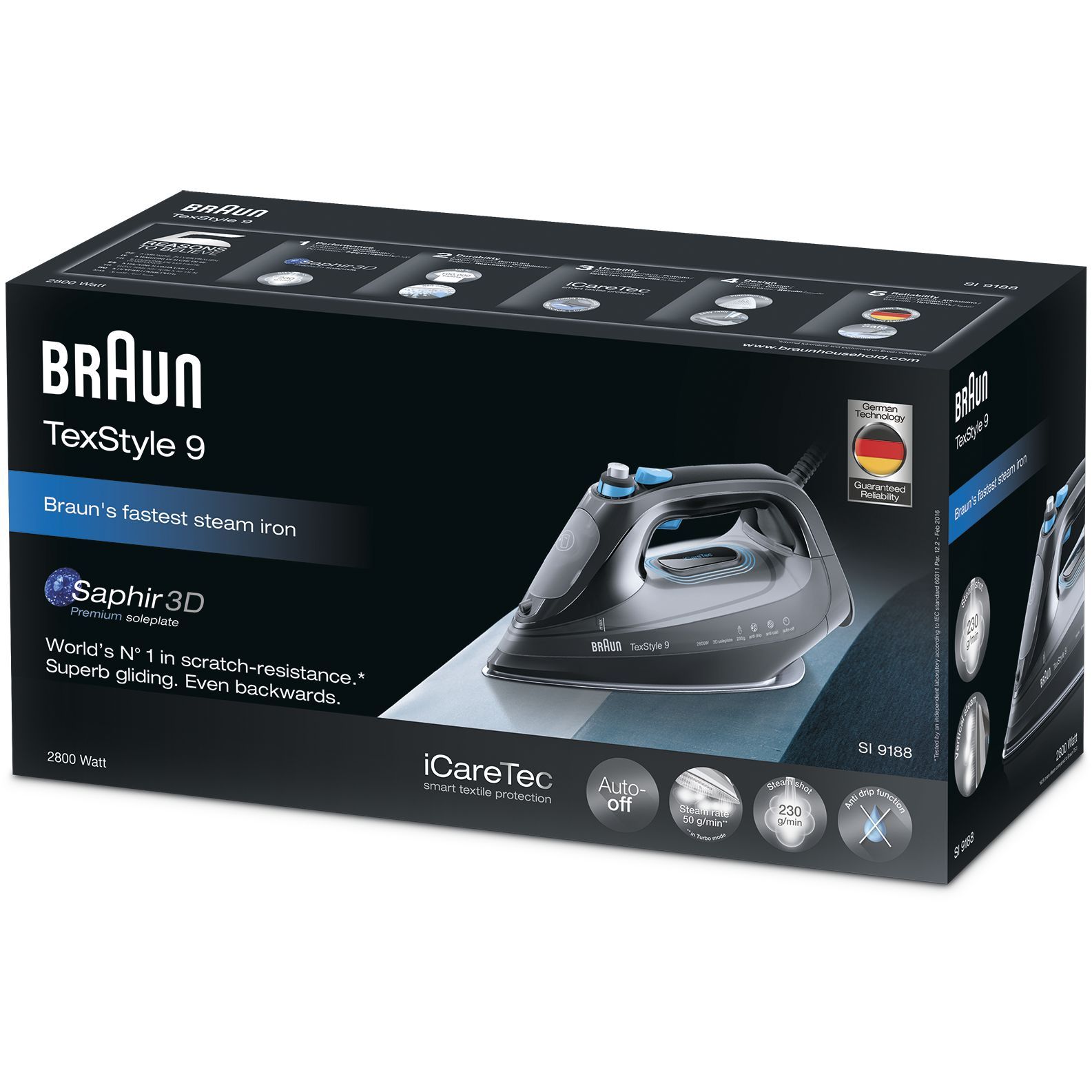 Noul TexStyle 9 este cel mai rapid fier de călcat cu aburi de la BRAUN și primul fier de călcat cu aburi a cărui talpă este prevăzută cu prima tehnologie FreeGlide 3D din lume. TexStyle 9 este prevăzut, de asemenea, modul iCare inteligent. Protejează hainele utilizând o temperatură sigură pentru toate tipurile de țesături, oferind o protecție inteligentă a materialelor textile.