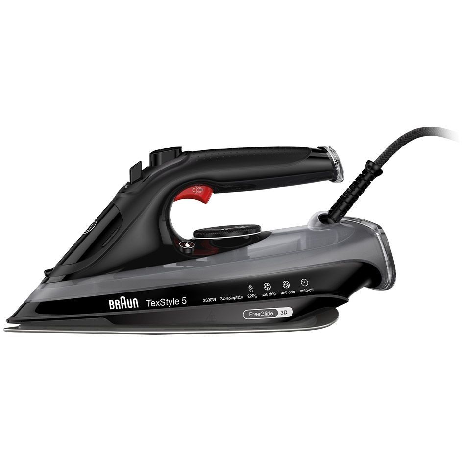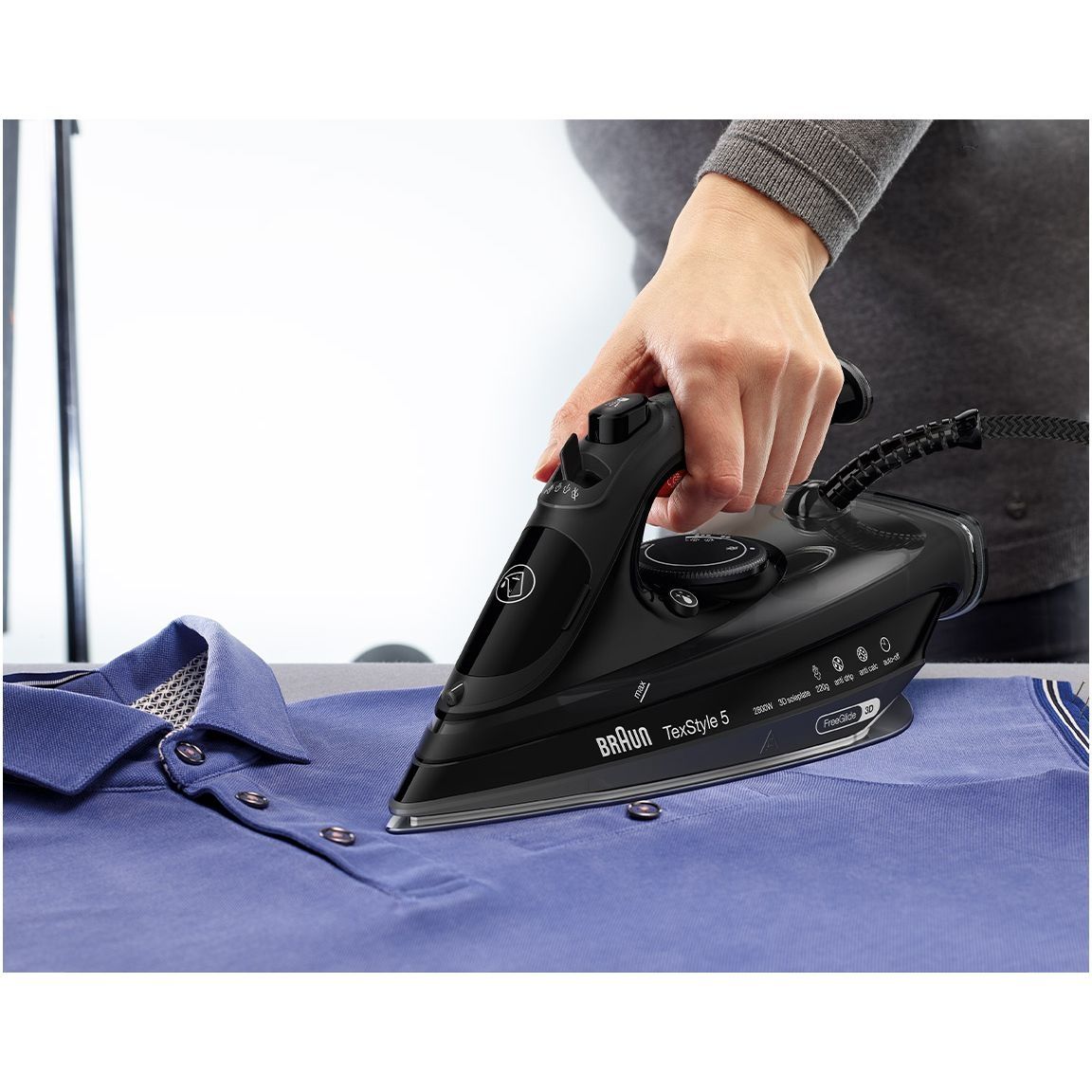 Braun TexStyle 5 - performanta si manevrare excelenta pentru sesiuni de calcat fara efort. Prevazut cu un maner ergonomic unic, fierul de calcat TexStyle 5 de la Braun imbina performanta cu manevrabilitatea pentru a oferi libertate maxima de miscare in timpul sesiunilor de calcat. Tehnologia FreeGlide 3D – prima tehnologie din lume pentru calcare 360˚. Talpa sa unica, cu o curbura ascendenta si marginile rotunjite, garanteaza o alunecare fara efort peste orice detaliu, in orice directie. Calcarea perfecta a hainelor se realizeaza in timp record datorita invelisului unic EloxalPlus. Asigura cel mai inalt nivel de durabilitate si o capacitate extraordinara de alunecare. Aburul variabil de pana la 50 g/min asigura rezultate rapide iar jetul de abur de pana la 220 g/min face fata chiar si celor mai dificile cute, chiar si vertical. Astfel, sesiunile de calcat sunt rapide si confortabile.