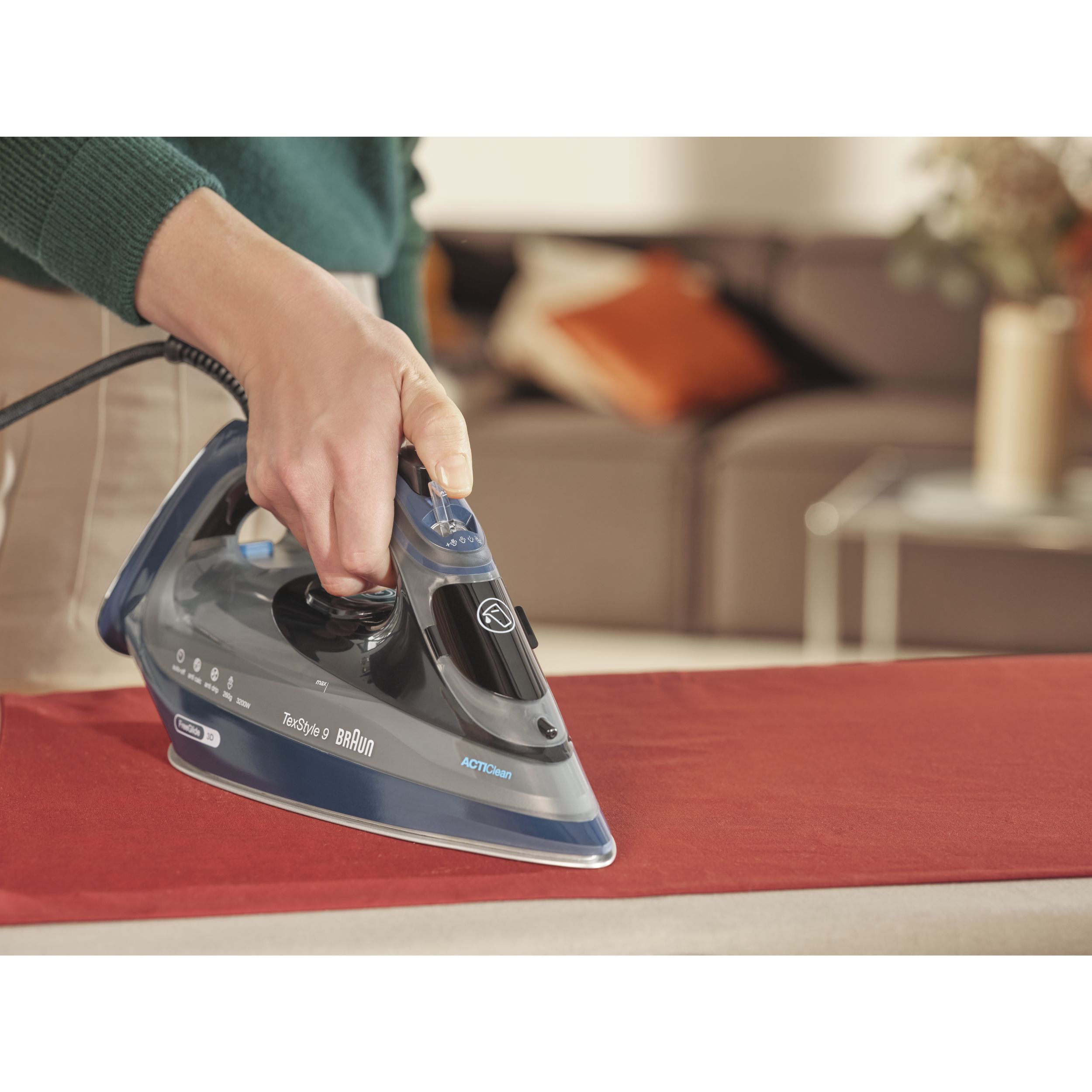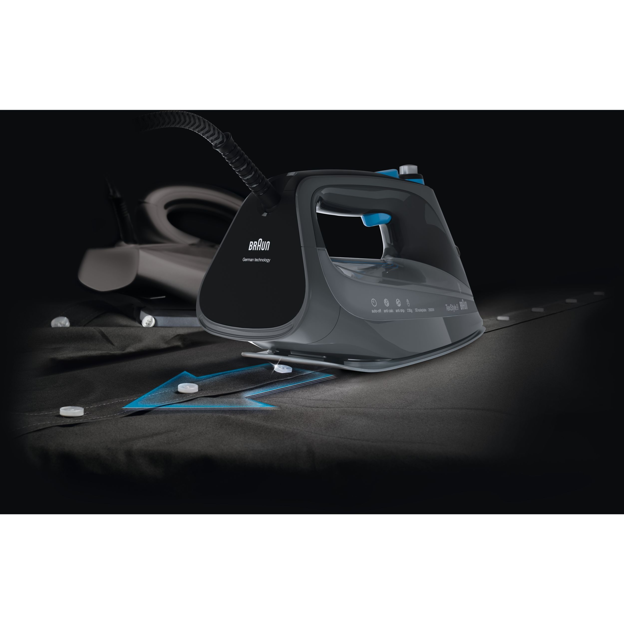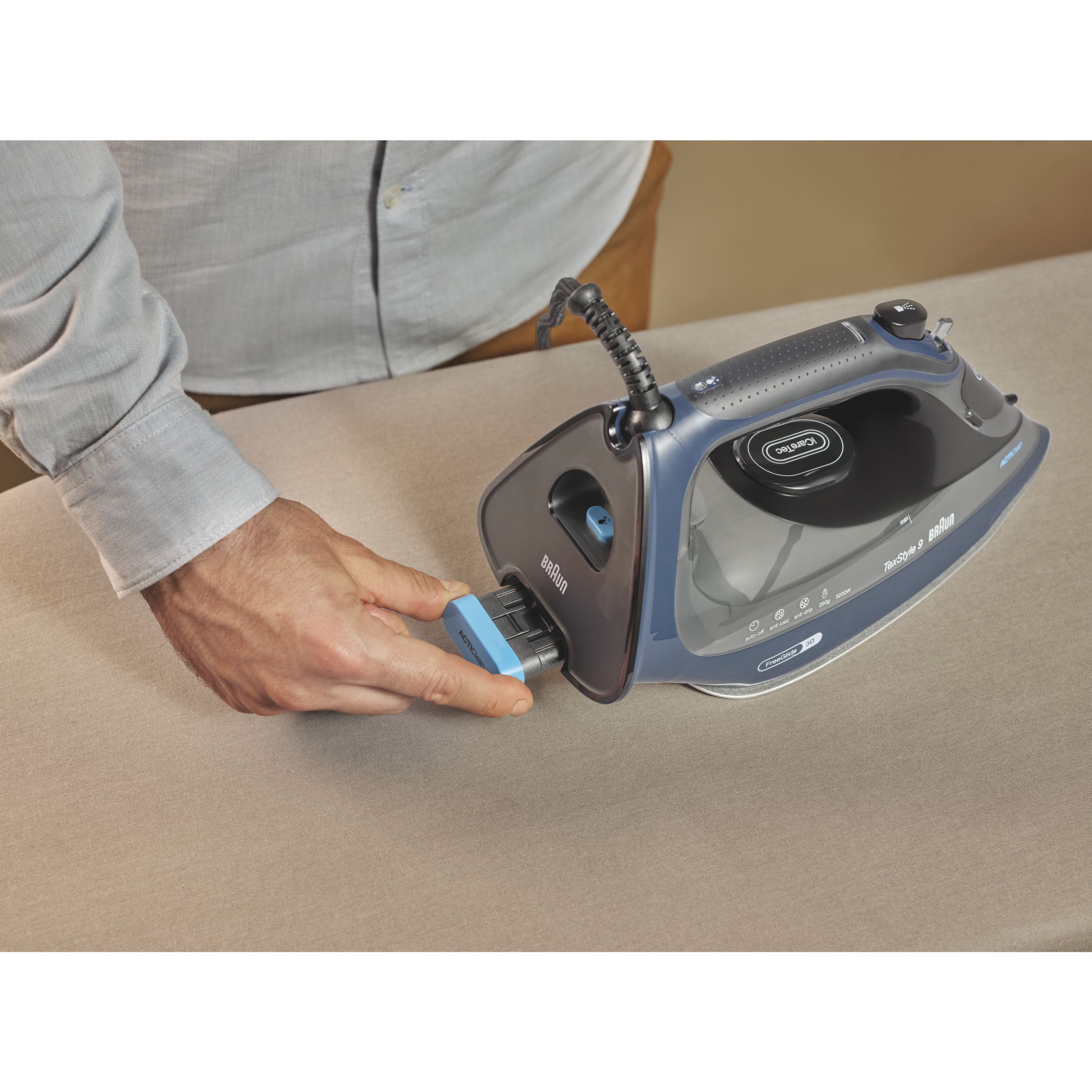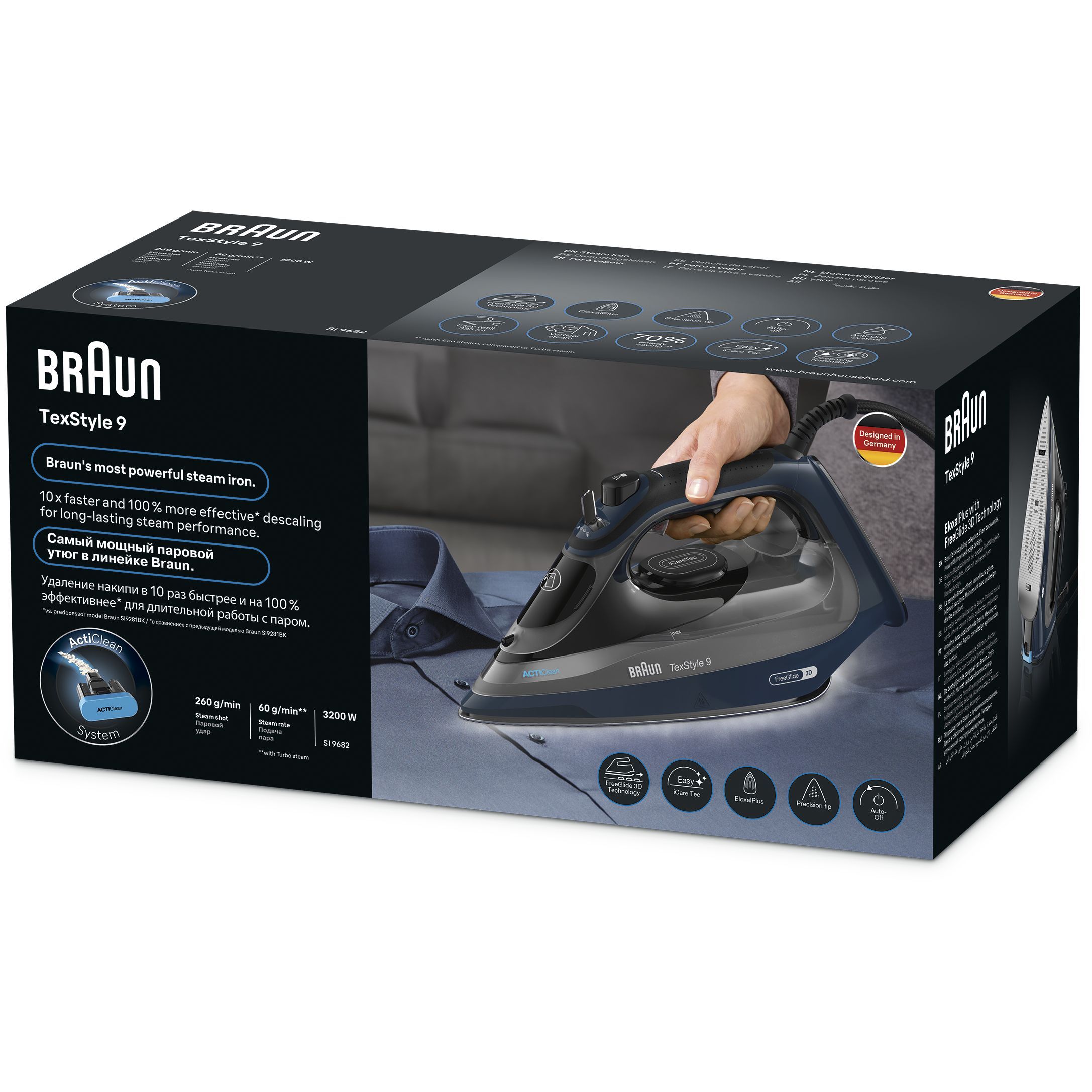 TexStyle 9 este cel mai puternic fier de călcat cu aburi de la BRAUN, care are o putere de 3200W și este prevăzut cu prima tehnologie FreeGlide 3D din lume. În plus, este prevăzut cu noul sistem ActiCIean. Colectorul de calcar are un design unic ce face ca îndepărtarea depunerilor să fie mai puțin dificilă și cu 100% mai eficientă*, prelungind durata de viață a fierului de călcat cu aburi. TexStyle 9 prezintă, de asemenea, tehnologia iCare care protejează hainele utilizând o temperatură potrivită pentru fiecare tip de țesătură - oferind o protecție inteligentă materialelor textile.