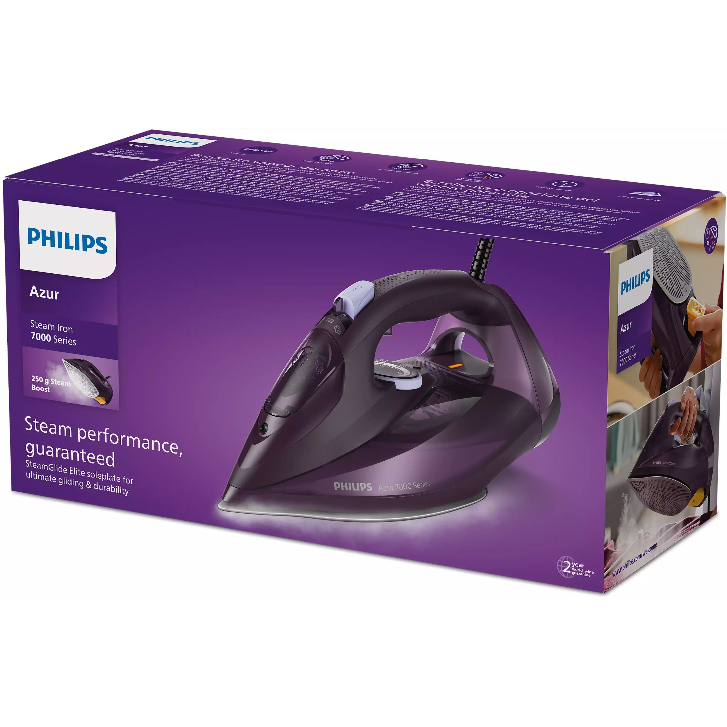 Fier de călcat cu abur Philips Azur Seria 7000 DST7051/30, 2800W, Continuu 50g/min, Jet 250g, Rezervor 300ml, Talpă SteamGlide Elite, Oprire automată, C2m, G1.82kg, Dark Violet