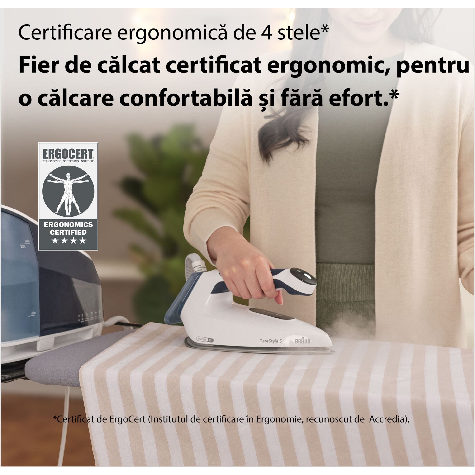 Îmbunătățește-ți rutina de călcat și economisește timp pentru ceea ce contează cu adevărat. Noua stație de călcat Braun CareStyle 5 este ultra-puternică, oferind un debit de abur continuu de până la 150g/min datorită tehnologiei inovatoare PowerSteam. Bucură-te de rezultate profesionale chiar și în cazul celor mai dificile cute. Certificat ergonomic*, fierul de călcat este proiectat pentru a oferi o sesiune de călcare fără efort. Mânerul deschis reduce presiunea de la nivelul încheieturii, favorizând o poziție naturală a mâinii. Bucură-te de plăcerea oferită de hainele bine călcate fără a compromite timpul și confortul tău prețios.