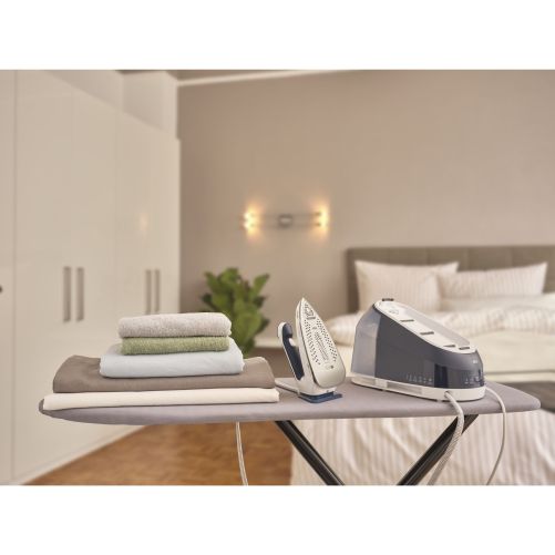 Așezare verticală - Design inteligent pentru mai puțină bătaie de cap și călcare mai ușoară. Datorită designului inteligent al suportului,așezarea fierului de călcat în poziție verticală pe masa de călcat este simplă și foarte stabilă.