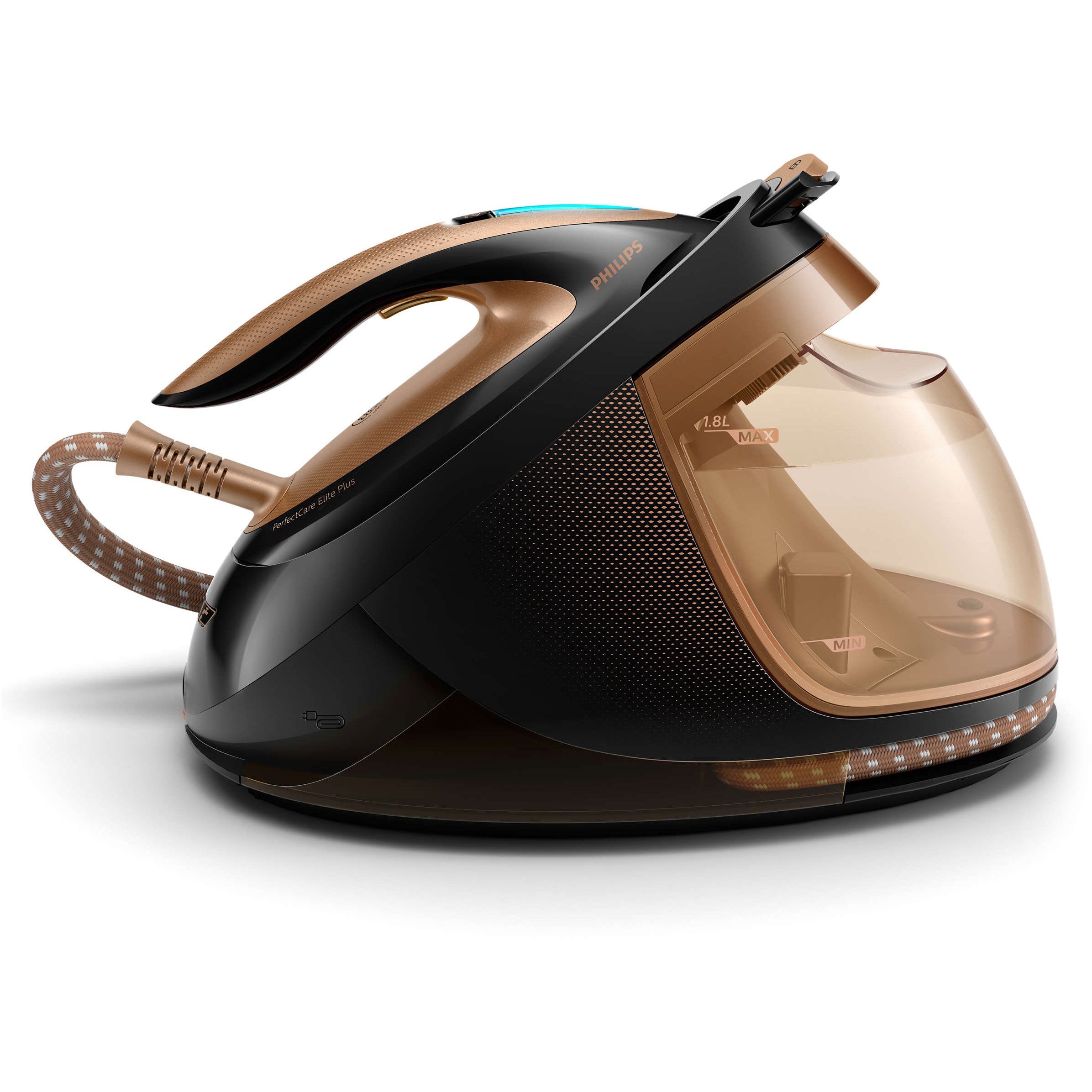 Recipient mare de apă, detaşabil pentru reumplere uşoară. Rezervorul transparent de 1,8 l îţi oferă până la 2 ore de utilizare continuă. Când rezervorul de apă se goleşte, vei fi avertizat de un indicator luminos. Oricând doreşti, poţi să umpli uşor rezervorul la robinet, prin uşa de umplere mare.
