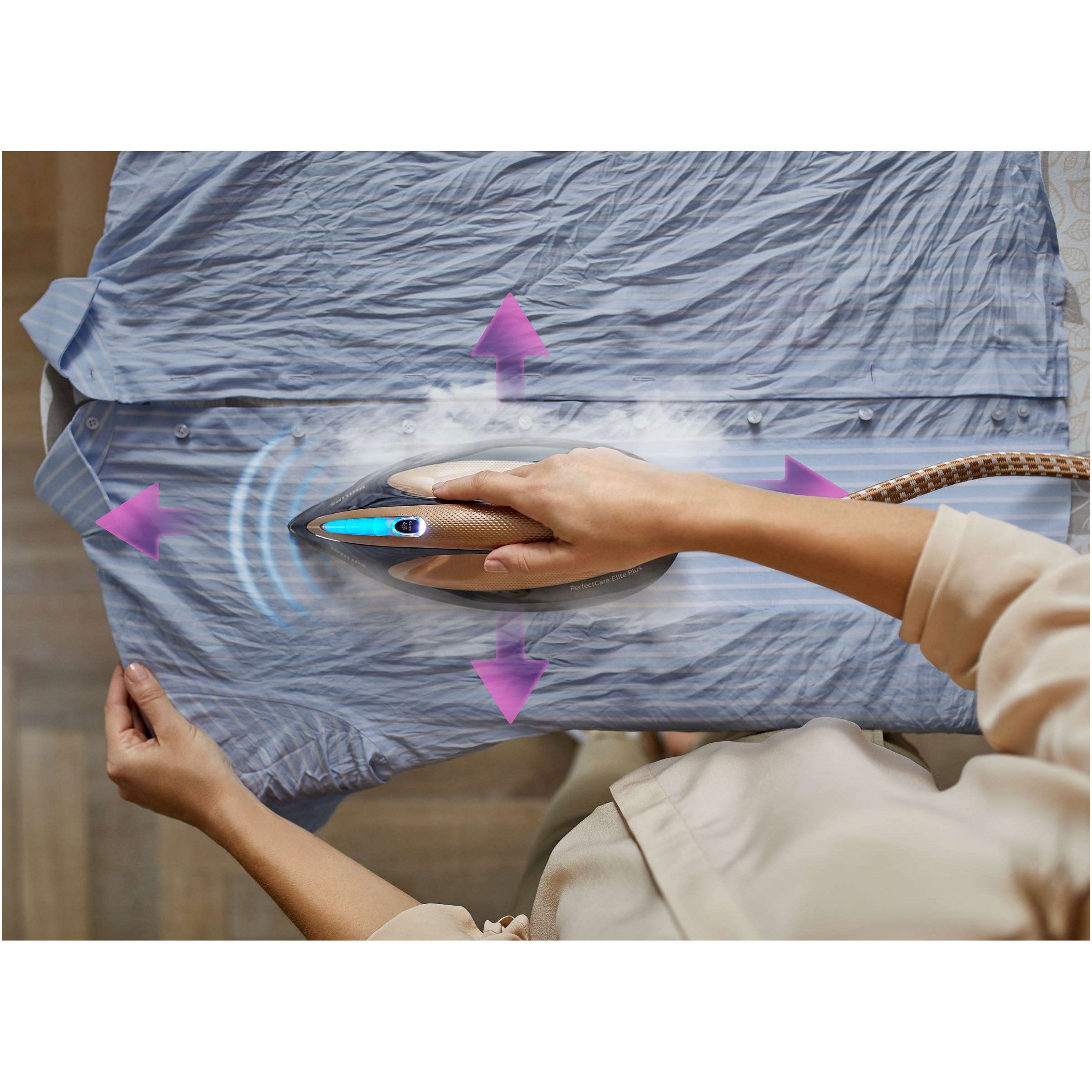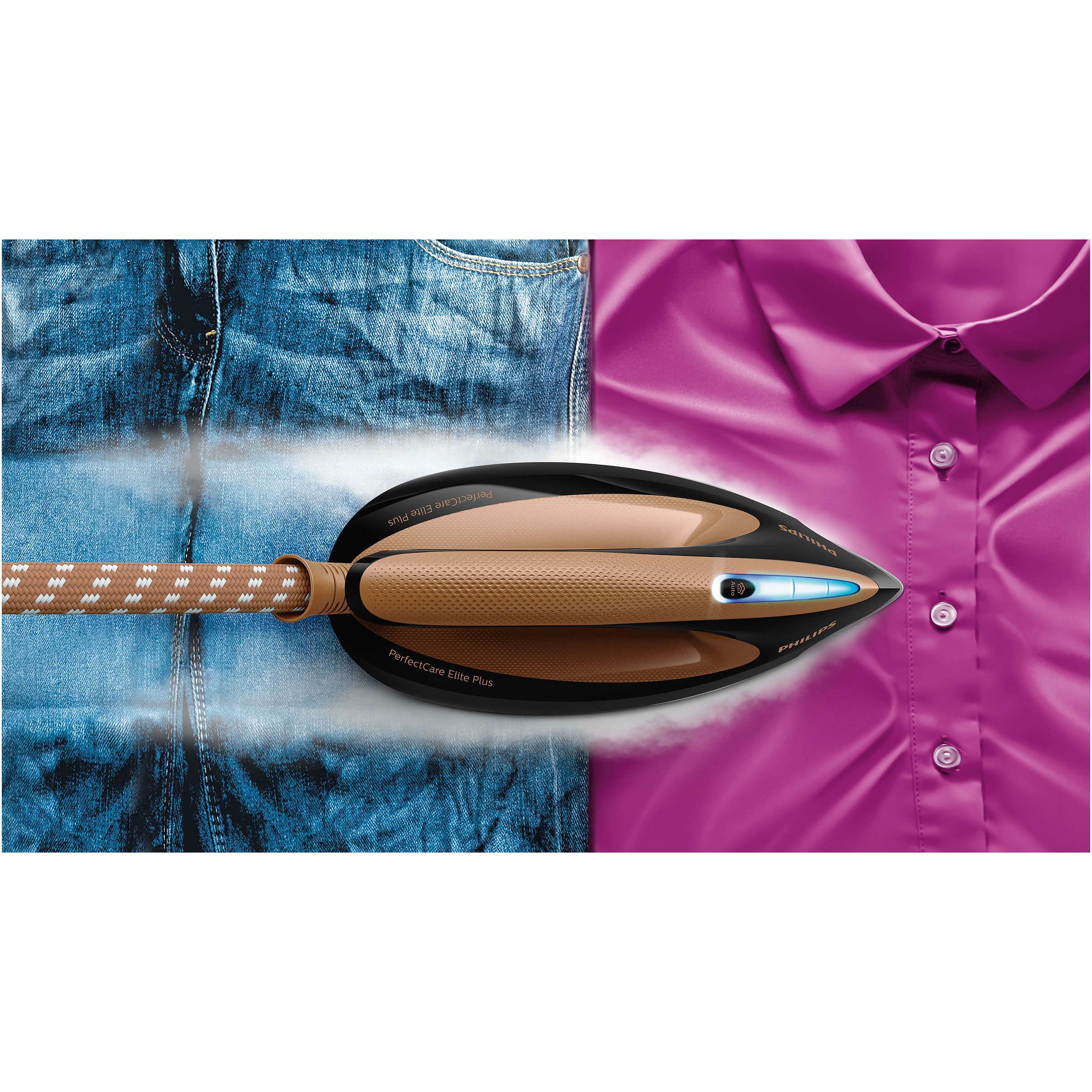 Fără arsuri – garantat. Graţie tehnologiei OptimalTEMP, garantăm că acest fier de călcat nu va produce arsuri pe niciun material care poate fi călcat. Poţi să îl laşi pe talpă pe haine sau pe masa de călcat. Fără arsuri şi fără a se crea luciu. Garantat.