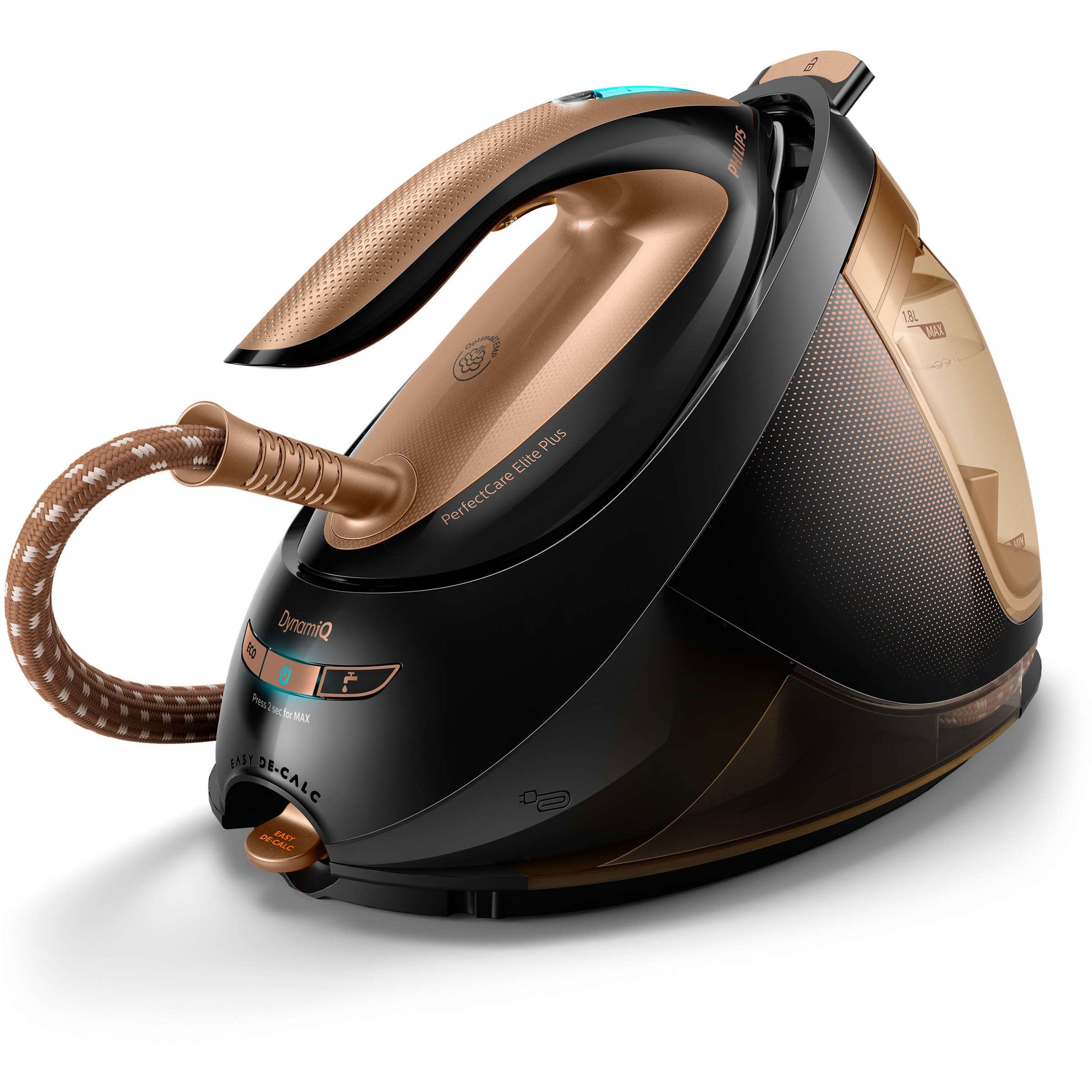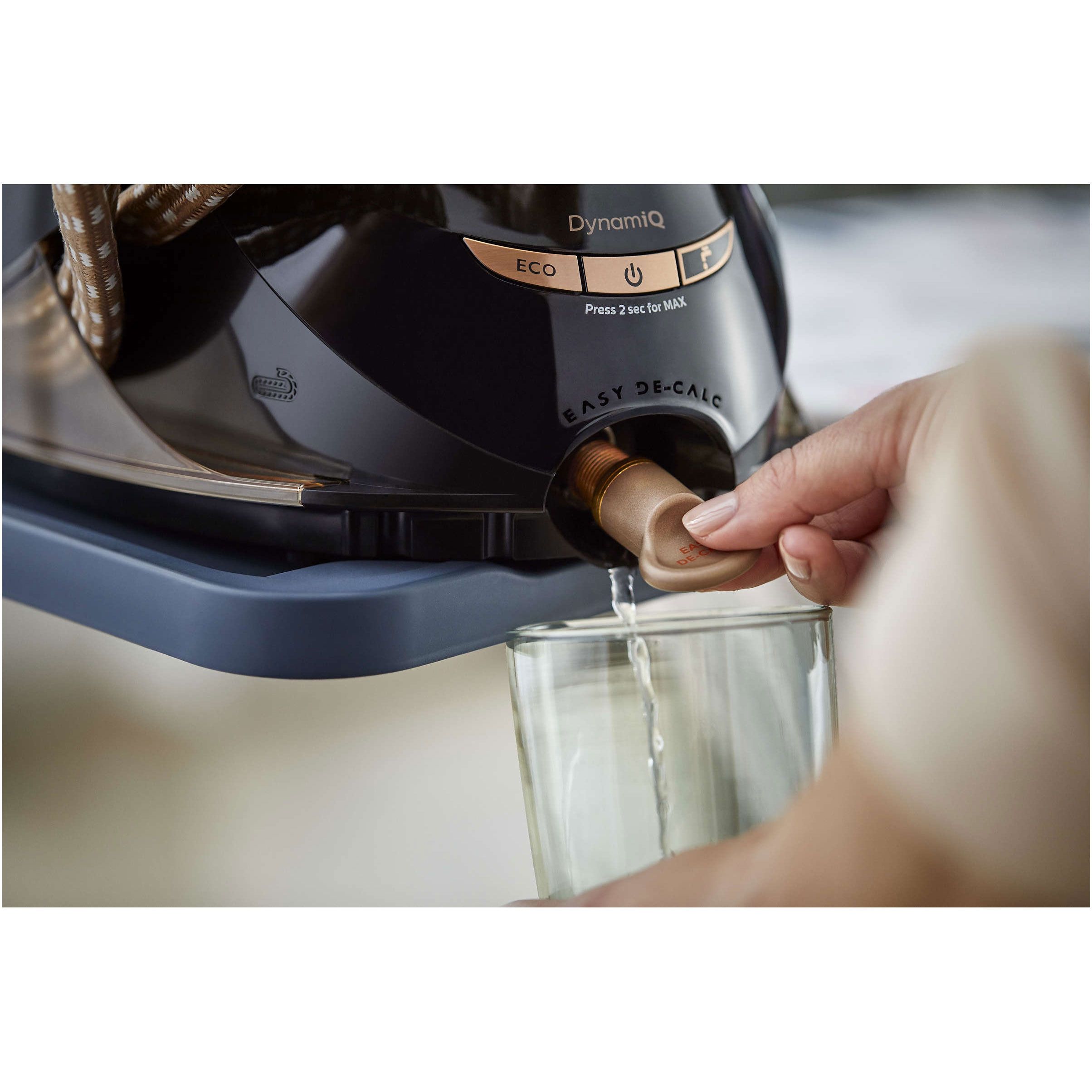 Sistem uşor şi eficient de decalcifiere pentru performanţă de durată. Detartrarea regulată îţi protejează fierul, îi prelungeşte durata de viaţă şi asigură cele mai bune performanţe ale aburului. Sistemul Easy De-Calc Plus colectează calcarul continuu, iar un indicator luminos şi un semnal sonor te anunţă când recipientul trebuie golit. Scoate doar dopul şi goleşte apa şi particulele de calcar.