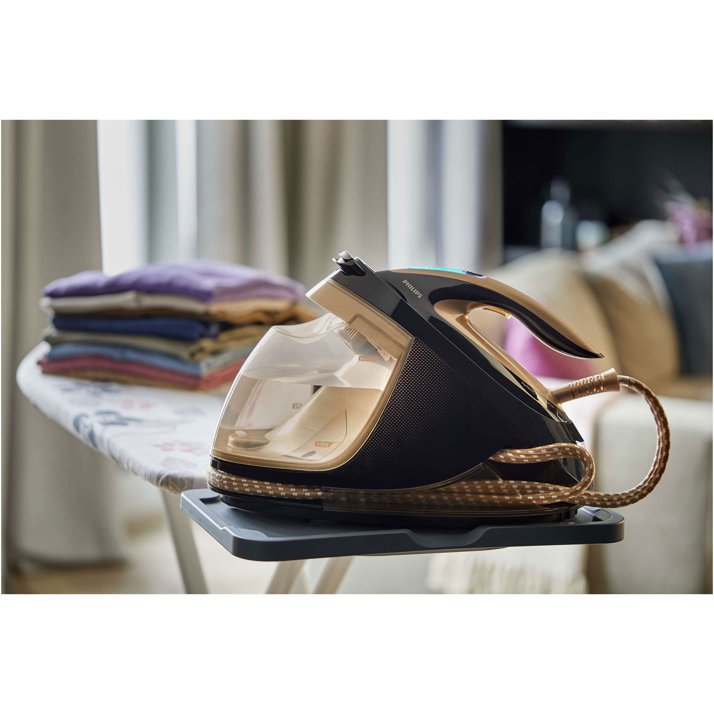 Călcat puternic cu zgomot minim. Filtrele de atenuare a zgomotului reduc la minimum zgomotul produs de abur, iar platforma fonoabsorbantă reduce zgomotul cauzat de vibraţiile unităţii de bază. Aburul puternic nu va acoperi astfel sonorul televizorului, muzica sau vocile celor din cameră.