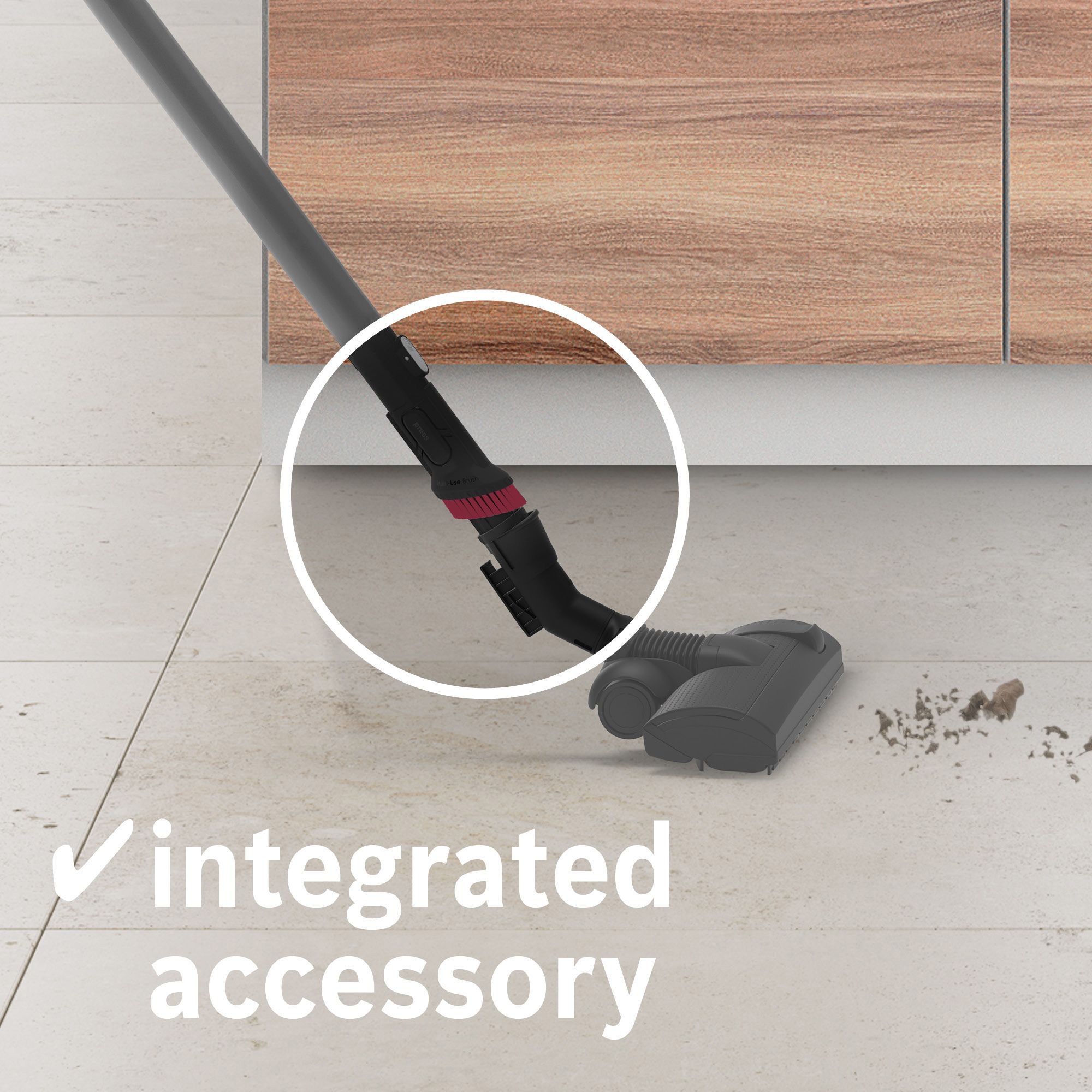 Curățarea locurilor greu accesibile cu ajutorul periei integrate. În fiecare locuință sunt locuri dificil de curățat precum colțurile sau tavanul. Cu ajutorul periei multifuncționale, integrate în aparat, poți curăța cu ușurință locurile greu accesibile. Perii moi asigură curățarea fără a zgâria suprafețele. Peria multifuncțională poate fi atașată tubului de aspirare sau mânerului.