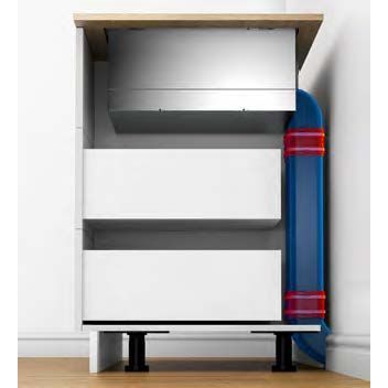 • Arcul vertical de 90° M are o rază medie ce permite mascarea parțială în interiorul mobilierului și oferă (în ceea ce privește poziționarea blatului) un spațiu minim de 475mm pentru sertarele unității de bază;