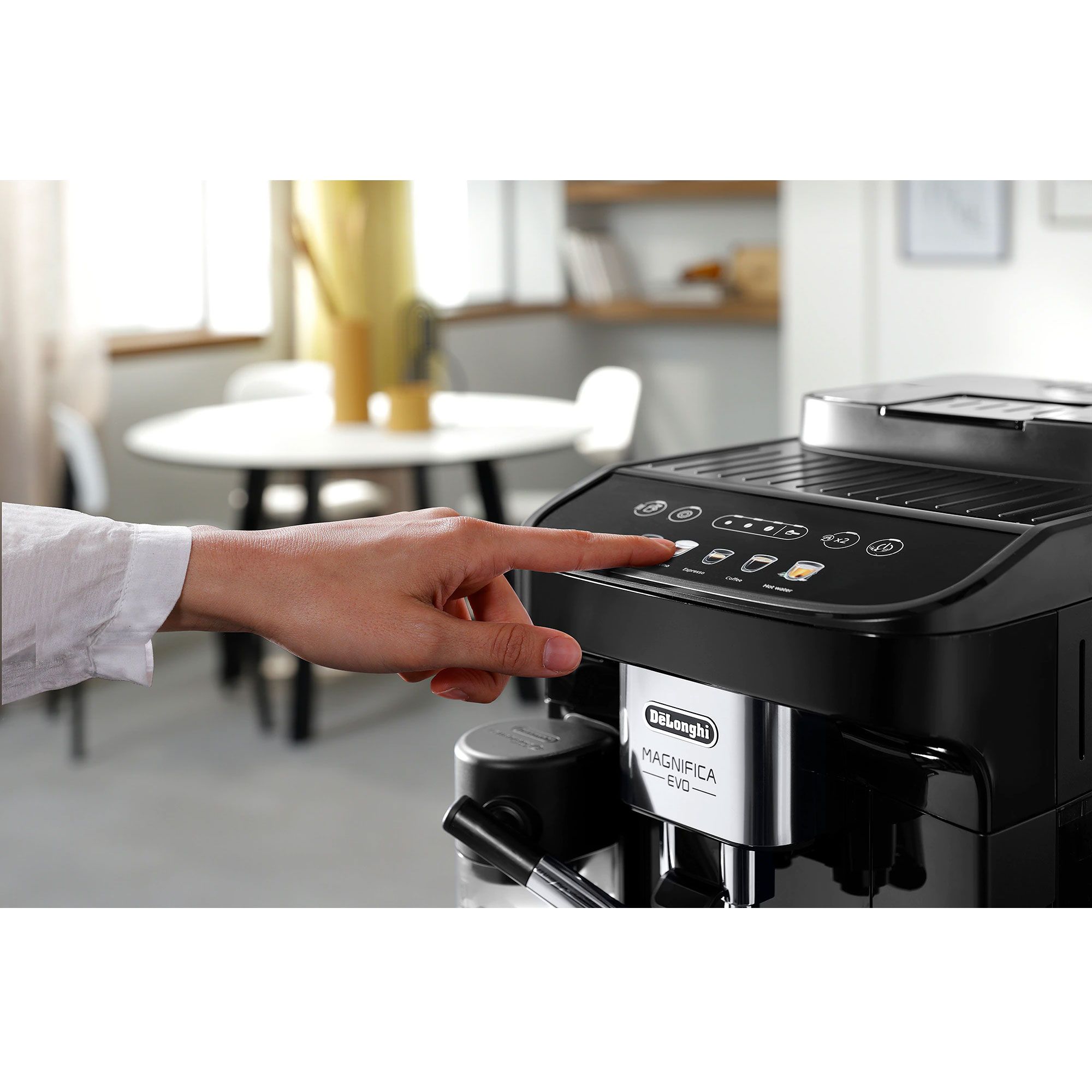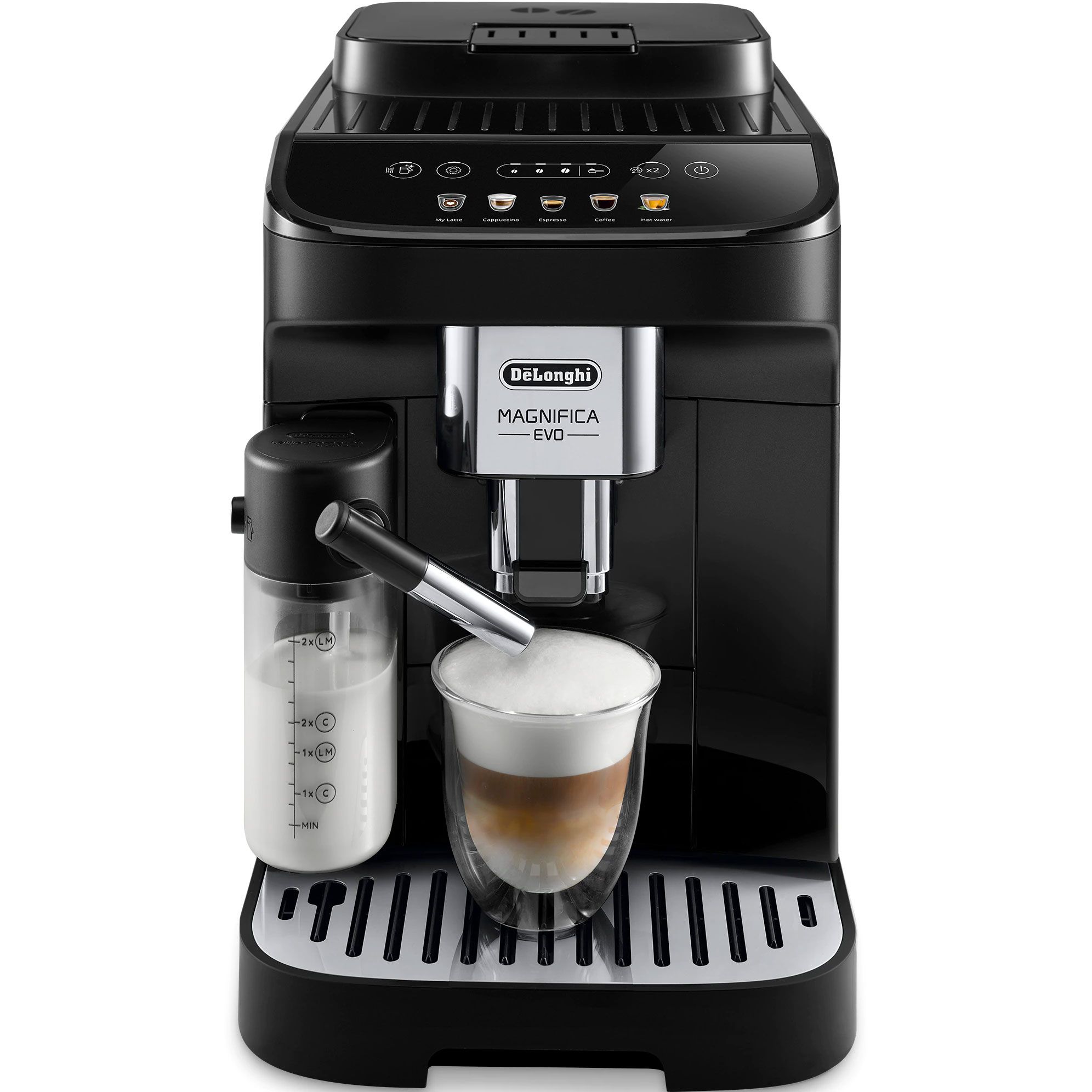 Magnifica Evo întruchipează experiența De'Longhi cu tehnologia sa avansată, băuturile autentice și designul elegant, negru, modern. Alegeți espresso-ul italian perfect dintr-un meniu variat de alte băuturi pe bază de cafea și lapte, cu 5 rețete preparate cu o singură atingere, disponibile prin intermediul afișajului color intuitiv. Bucurați-vă de textura mătăsoasă și catifelată a spumei de lapte dense și cremoase, grație Sistemului LatteCrema exclusivist.