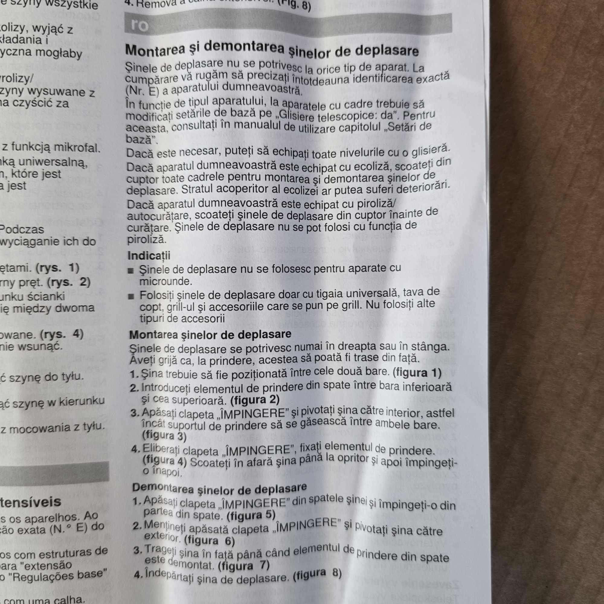 • Nu sunt compatibile cu funcţiile de curățare. Înainte de curăţare, scoateţi şinele dacă aparatul este dotat cu funcţia de piroliză sau cu funcţia de curăţare EcoClean