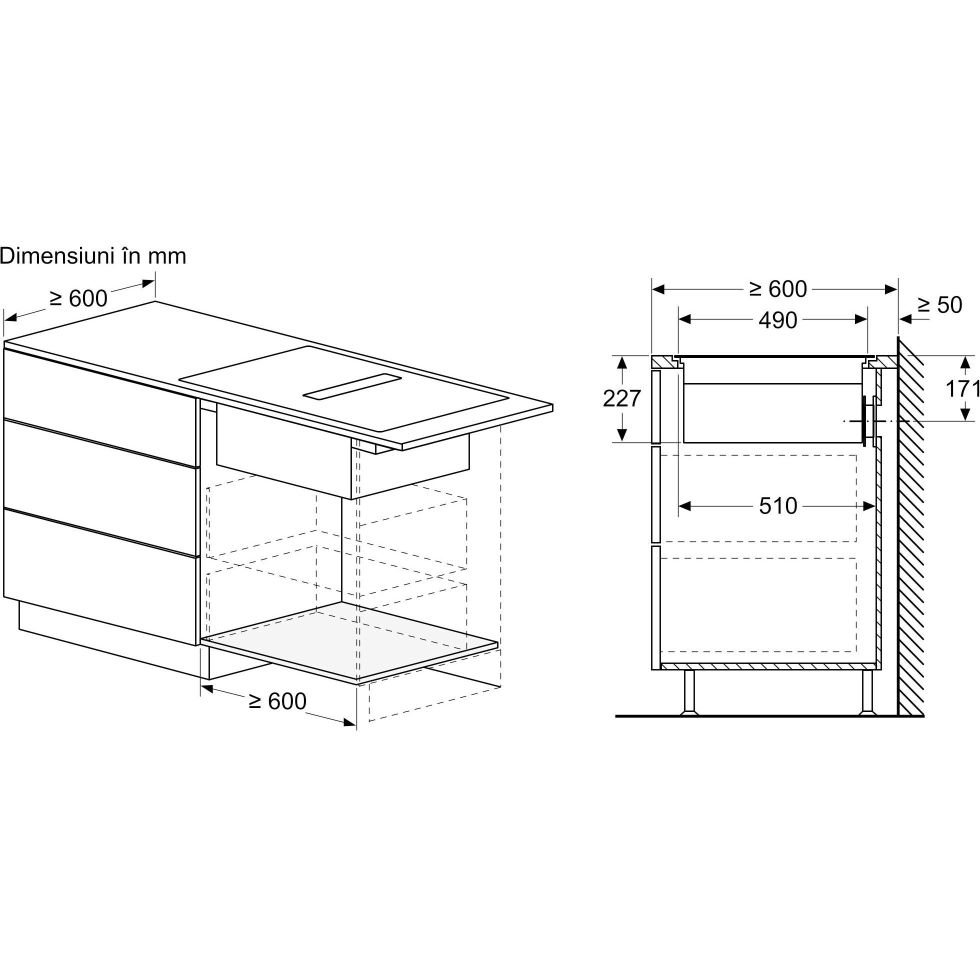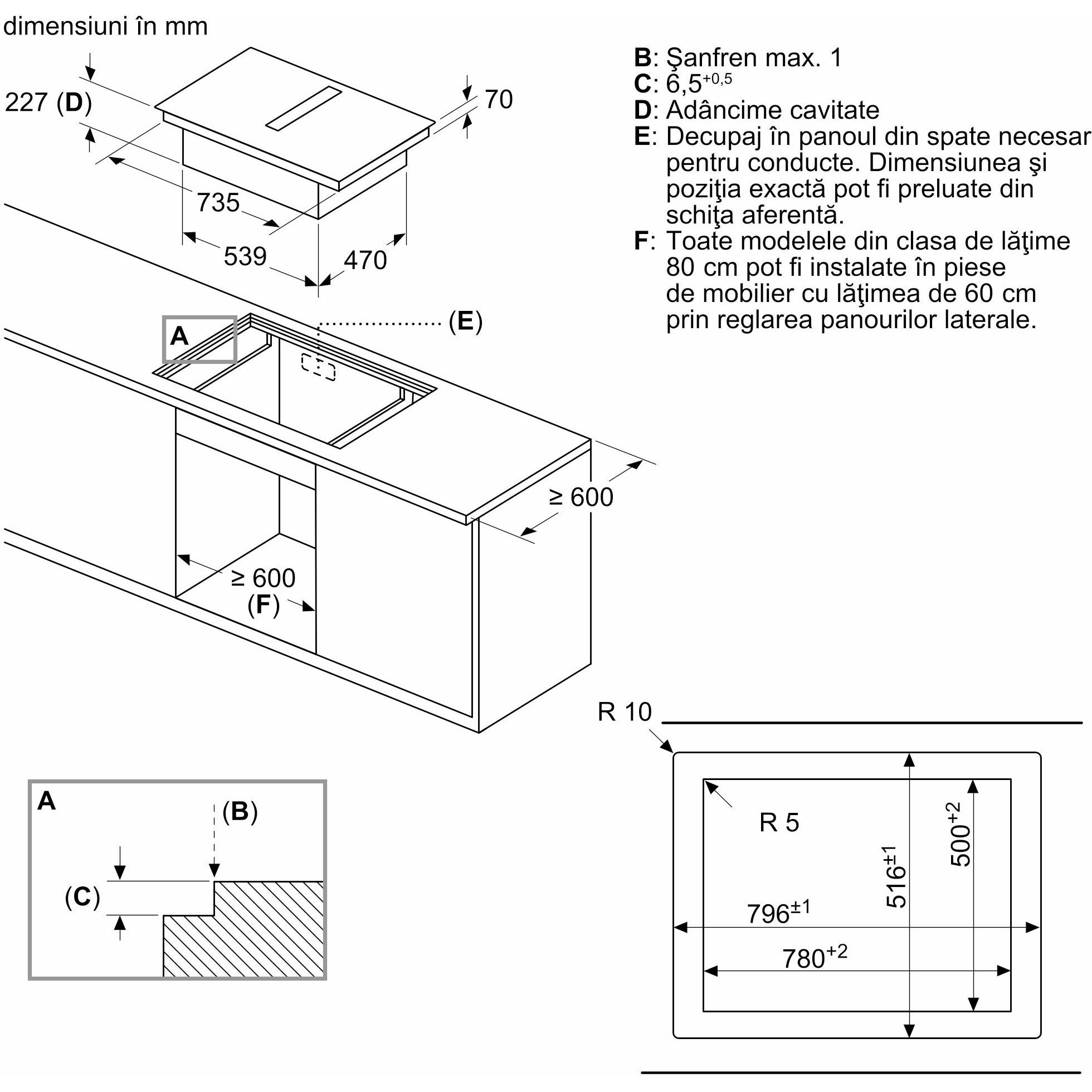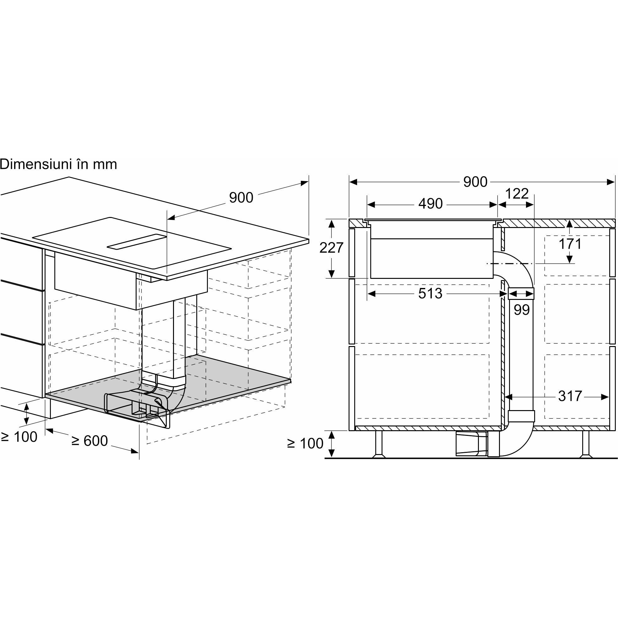- Nu este necesară o podea falsă sub plita cu sistem de ventilare integrat. Sertarele și/sau rafturile din dulap trebuie să fie detașabile. Panoul din spatele dulapului poate fi păstrat, însă o decupare este necesară pentru duza de aer (pozitionarea și dimensiunea se regăsesc în instrucțiunile de instalare).