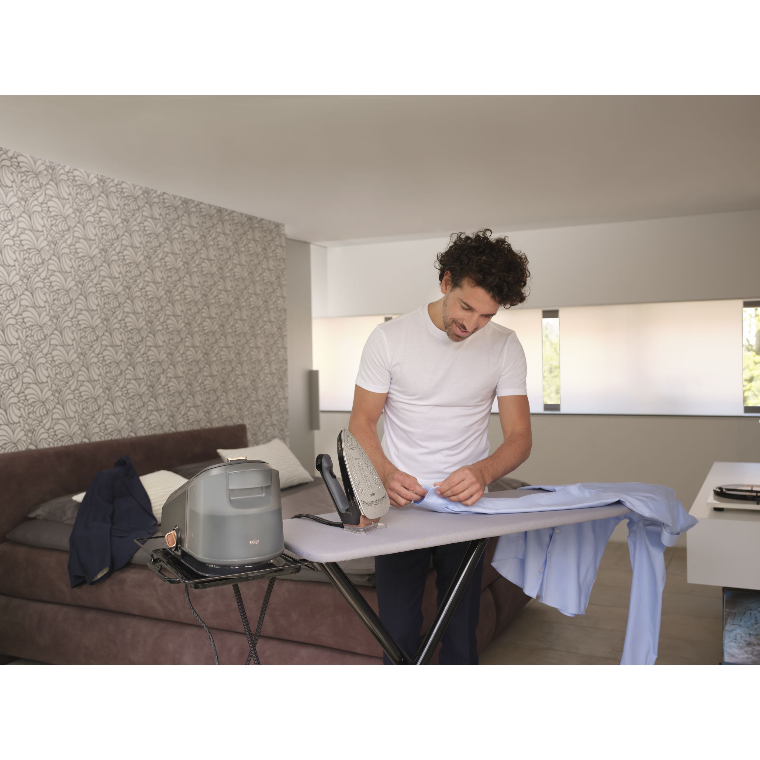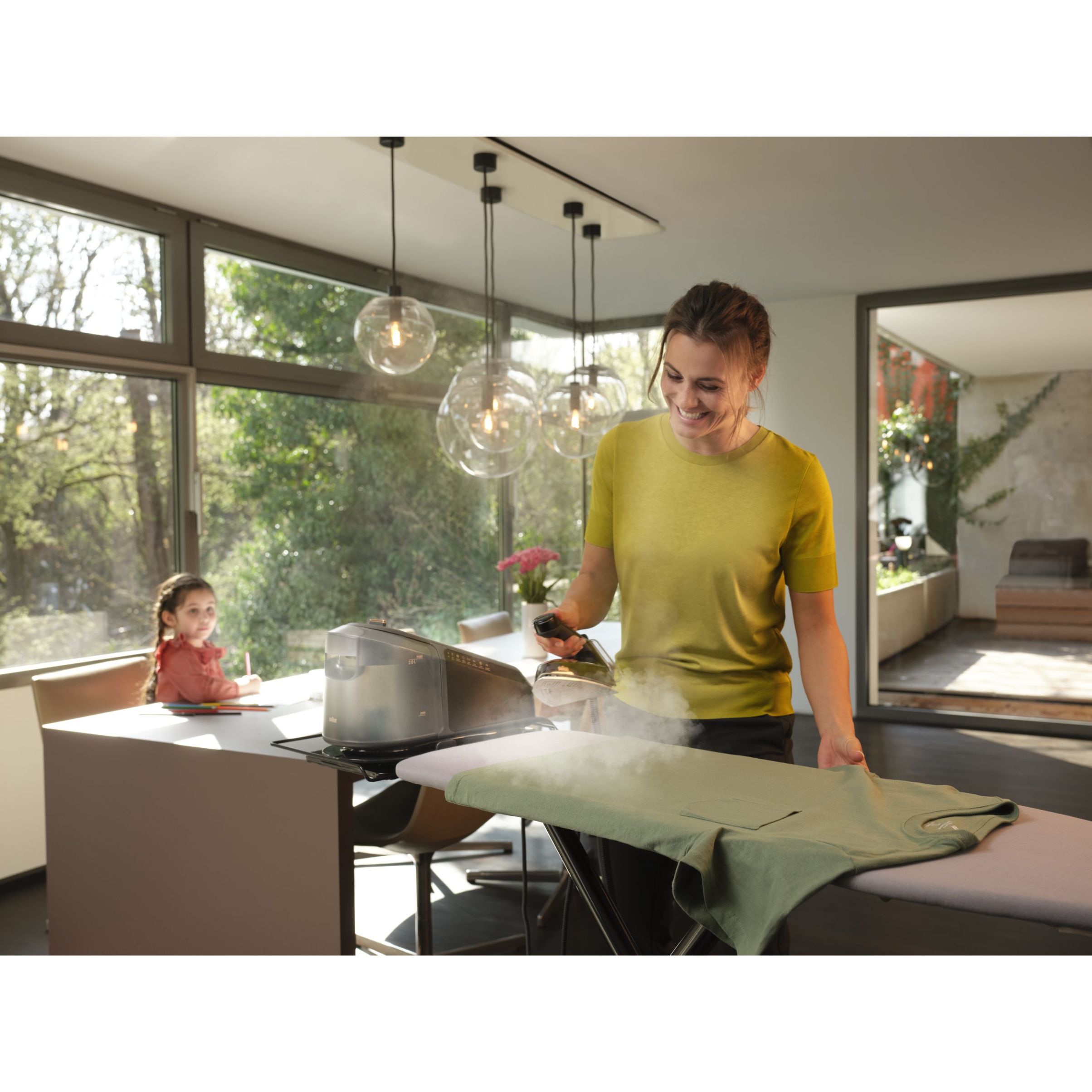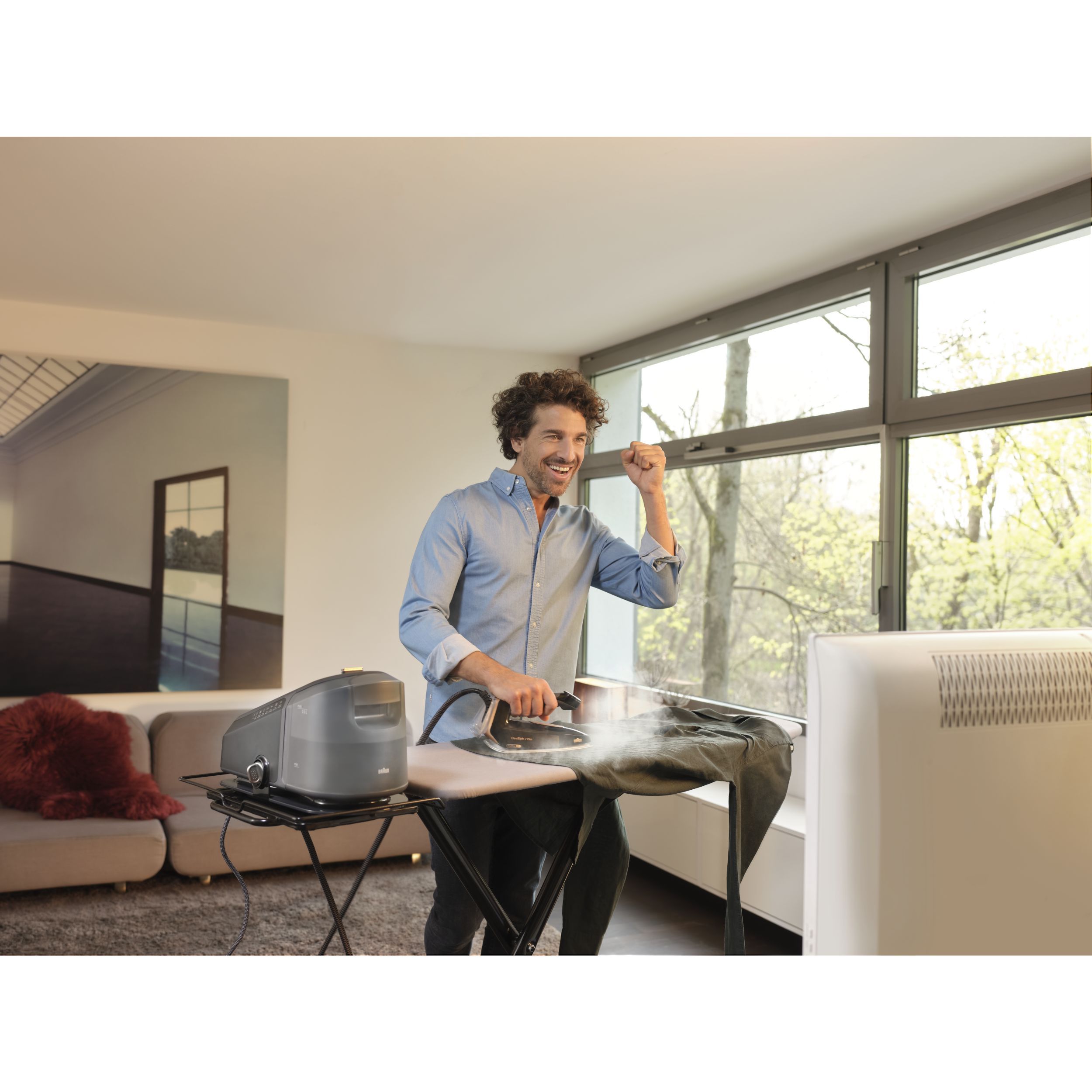 Călcat vertical - Datorită aburului său puternic continuu,călcatul vertical cu abur al perdelelor și al hainelor agățate este foarte simplu.