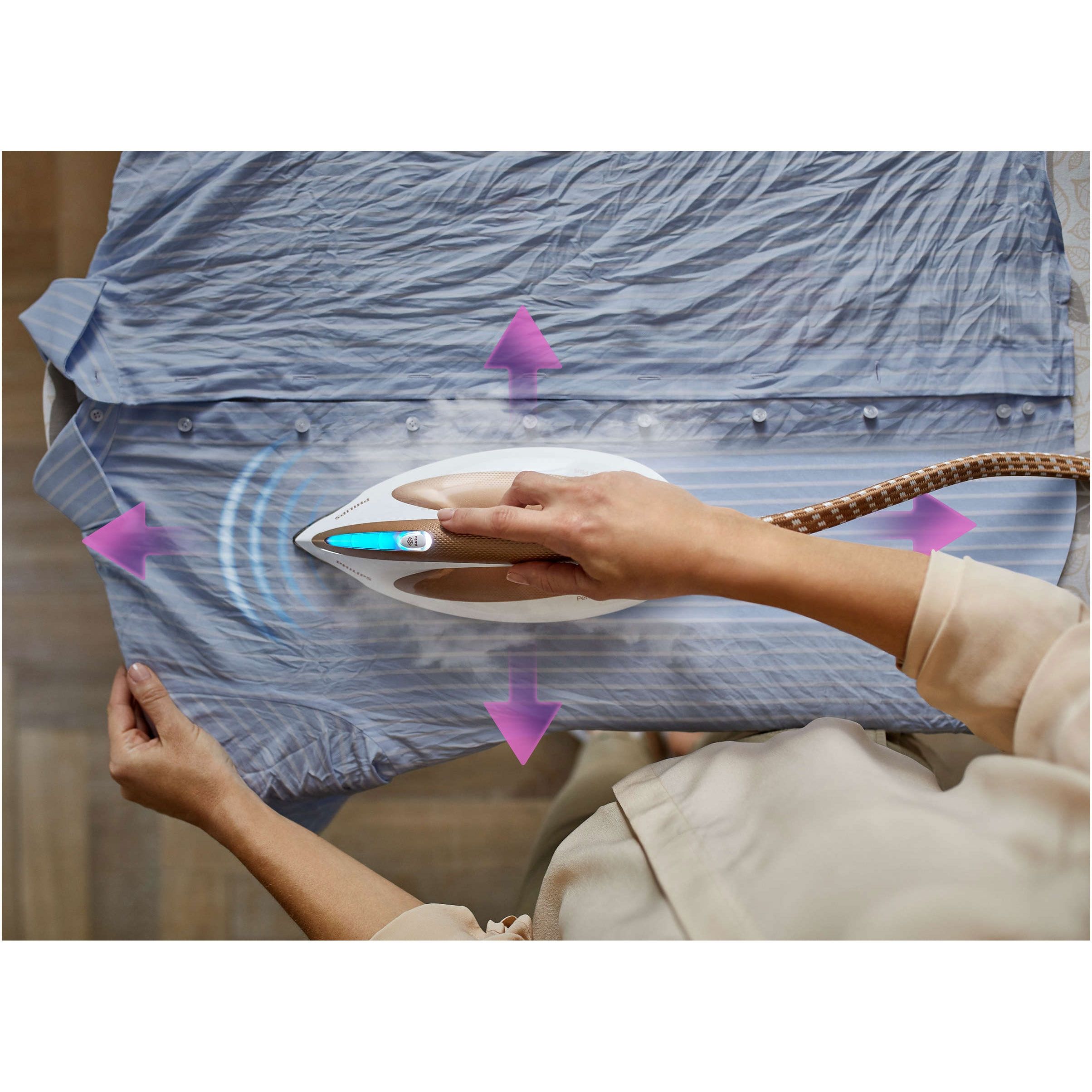 Fier uşor şi comod de manevrat. Fierul este incredibil de uşor şi comod de manevrat, alunecând uşor şi reducând solicitarea asupra încheieturii mâinii. Datorită greutăţii minime, poate fi folosit uşor şi eficient şi pentru călcarea verticală a perdelelor şi a hainelor de pe umeraş.