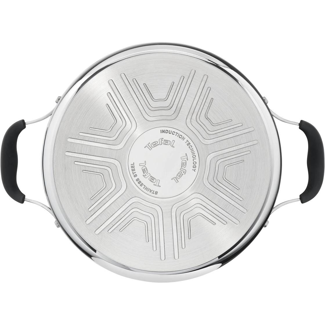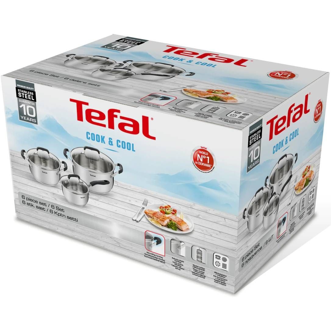 Set de 6 piese TEFAL Cook & Cool E493S674, Oțel inoxidabil, Pentru orice suprafață, Mânere fixe nituite siliconate, DW Safe