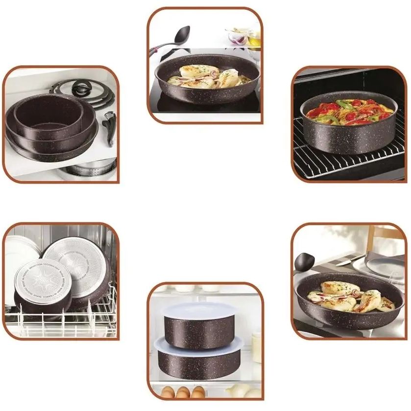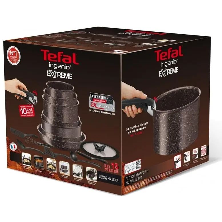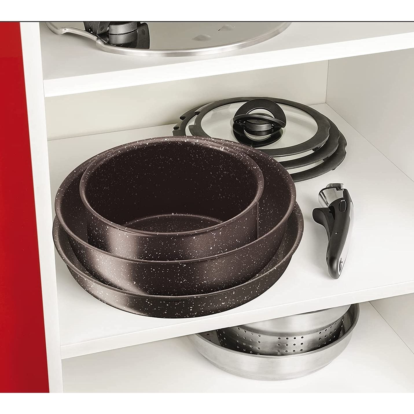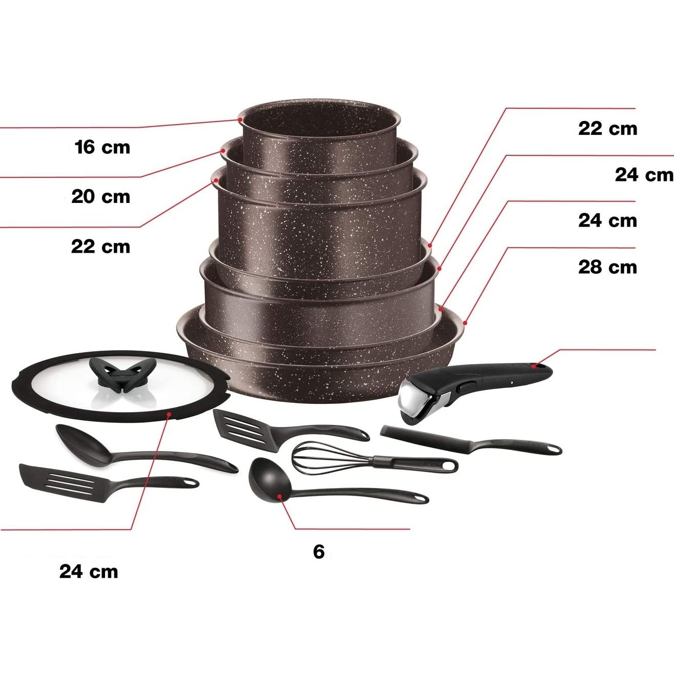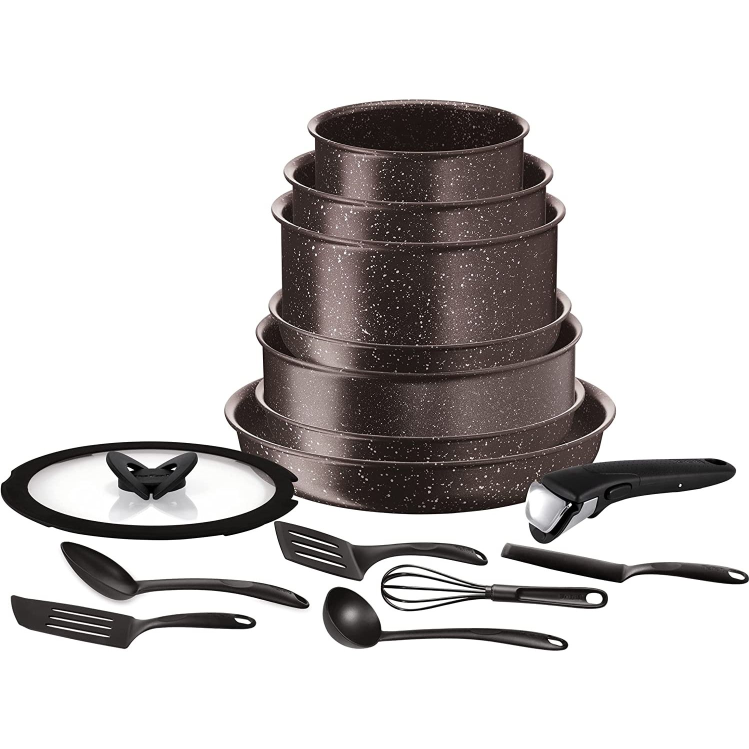 Set de vase Tefal Ingenio Extreme L6789102, Aspect piatră, 15 piese, Aluminiu, Suprafață anti-aderentă Titanium Mineralia2X, Sistem Thermo-Spot, Compatibil cu toate sursele de căldură, Culoare: Maro