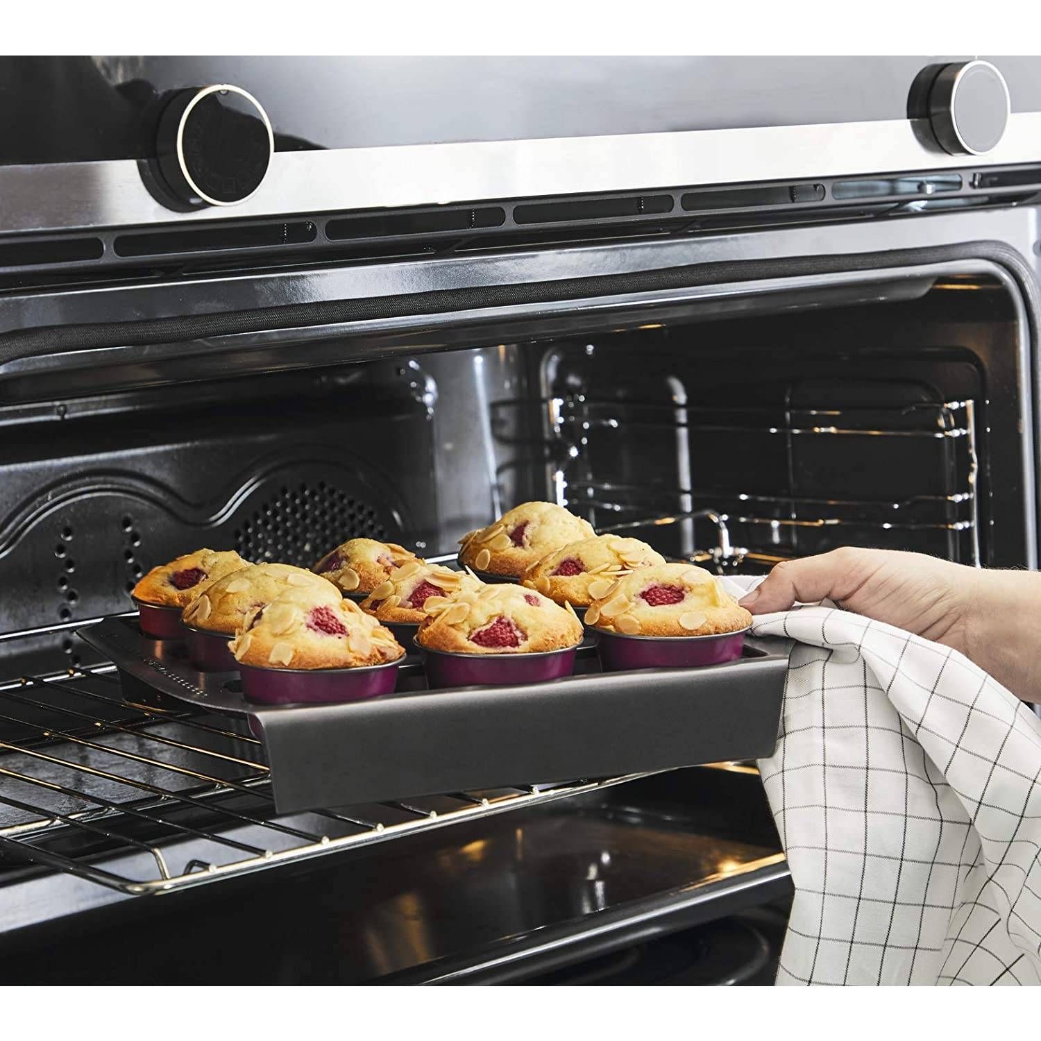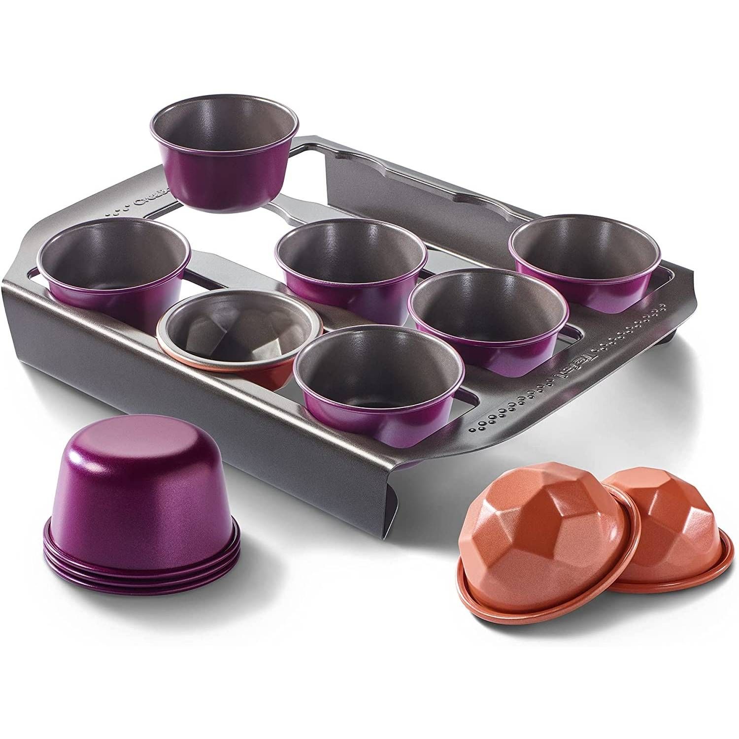Set de 3 forme TEFAL CreaBake Muffins J3069404, D7.5cm, Oțel carbon, Suprafață antiaderentă, Compatibil cu Cake Factory Délices, Dulcis Grey-Byzantium Purple