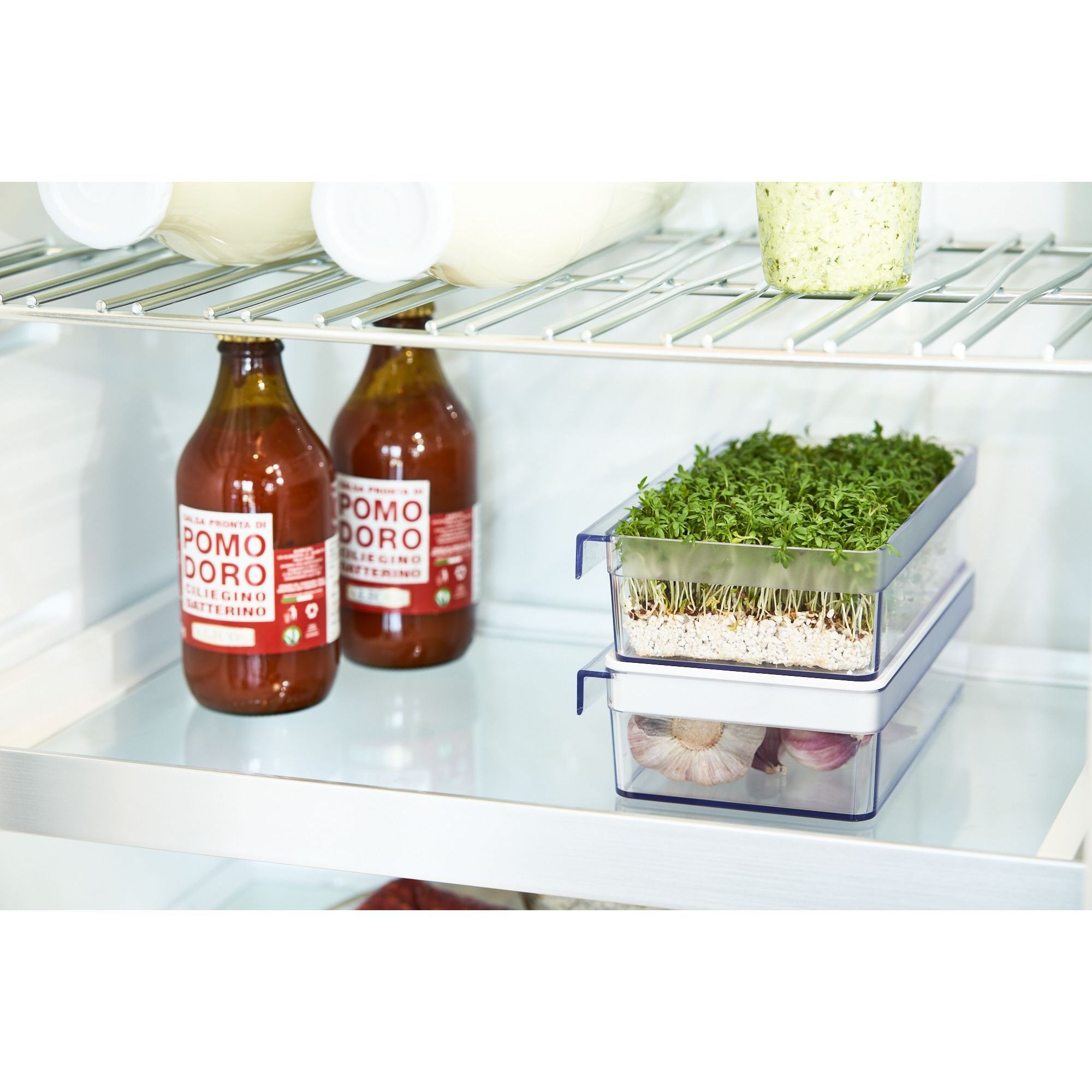 • Șinele metalice sunt ușor de reglat în înălțime și astfel optimizează volumul din ușa frigiderului