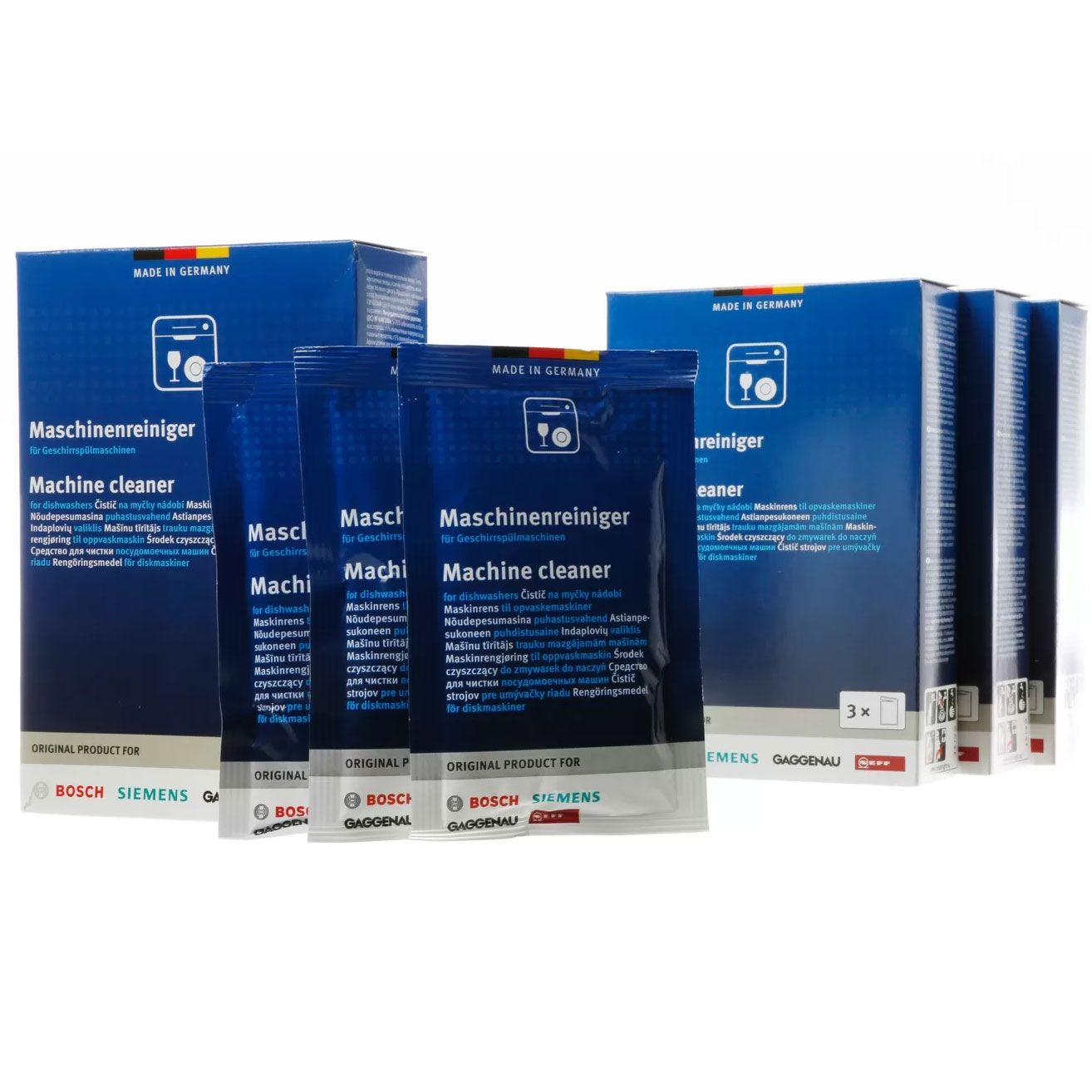 Set BOSCH 00312257, Conține 4 cutii a câte 3 plicuri de 45g, Pentru mașinile de spălat vase, Înlătură eficient grăsimea, amidonul și reziduurile de proteină, Curăță eficient furtunurile și pompa