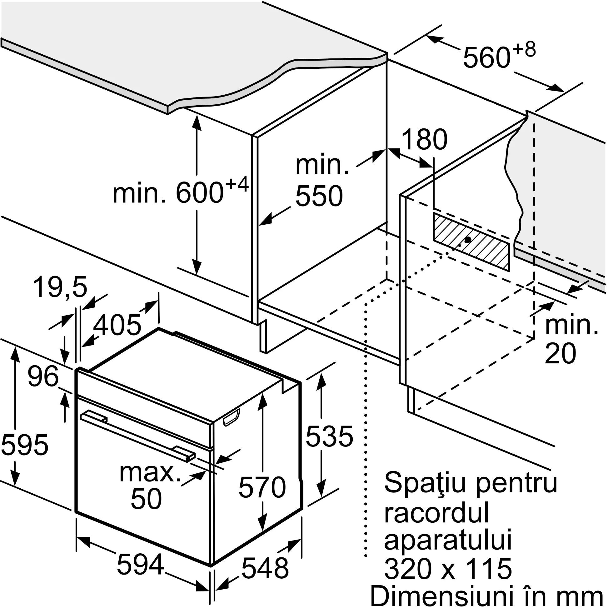 Dimensiuni nișă (ÎxLxA): 560 mm - 568 mm x 585 mm - 595 mm x 550 mm