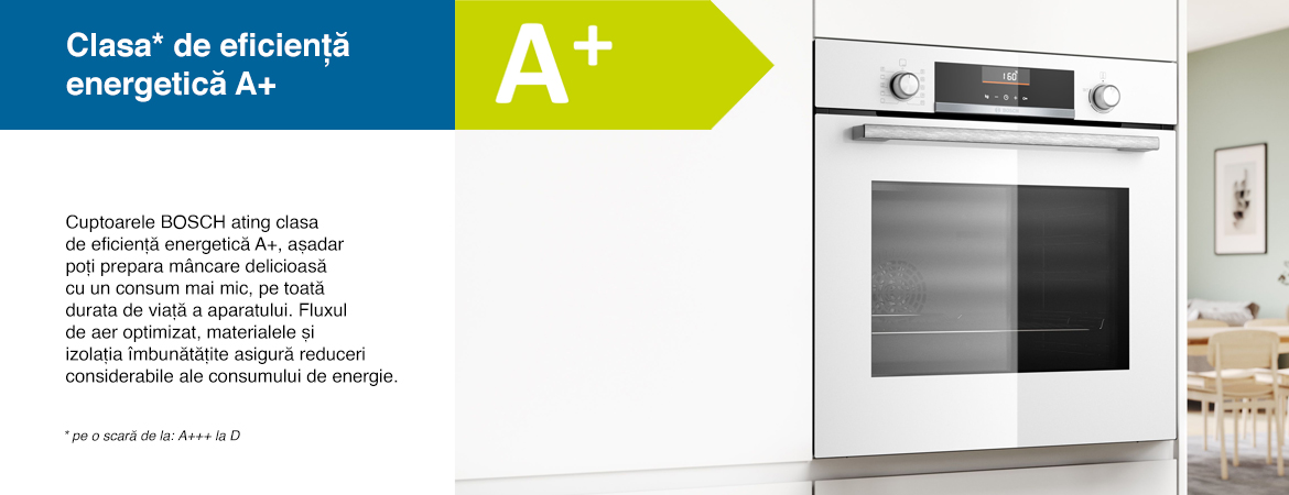 • Clasa de eficiență energetică A+: datorită tehnologiei îmbunătățite a cuptorului, poți economisi energie în timp ce gătești