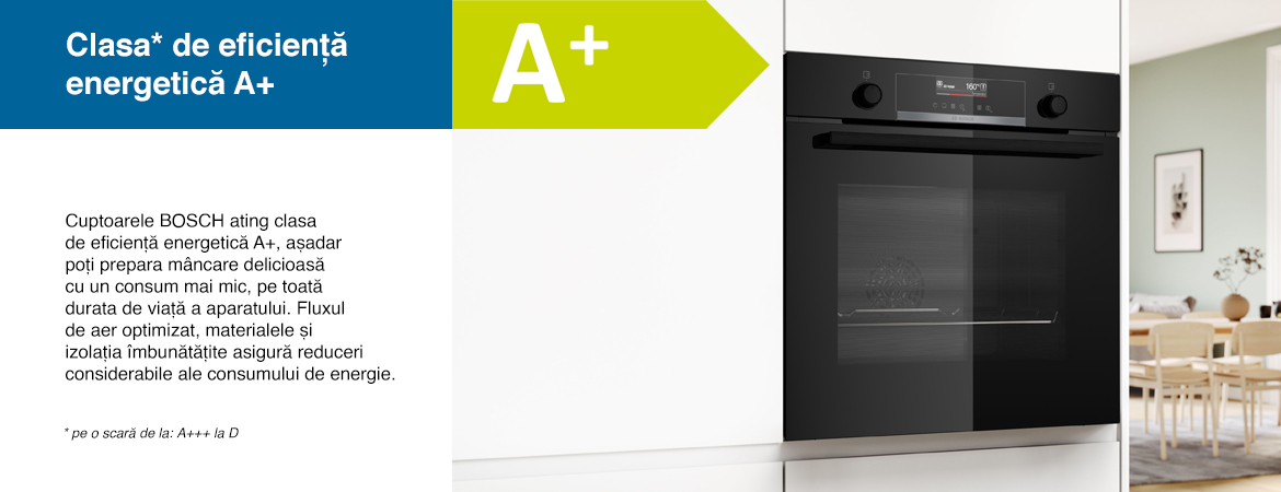 Cuptoarele Bosch ating clasa de eficiență energetică A+, așadar poți prepara mâncare delicioasă cu un consum mai mic, pe toată durata de viață a aparatului. Fluxul de aer optimizat, materialele și izolația îmbunătățite asigură reduceri considerabile ale consumului de energie.