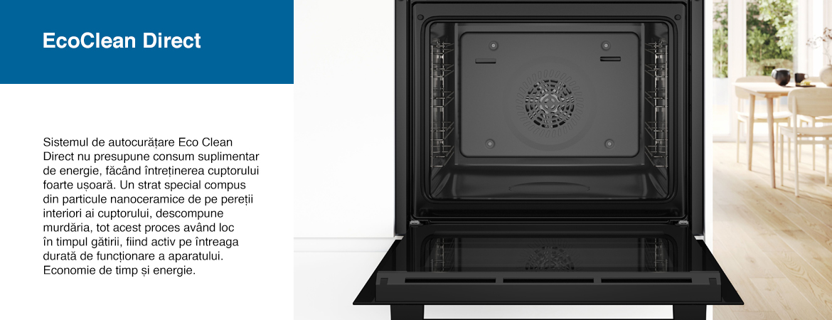 Sistemul de autocurățare Eco Clean Direct nu presupune consum suplimentar de energie, făcând întreținerea cuptorului foarte ușoară. Un strat special compus din particule nanoceramice de pe pereții interiori ai cuptorului, descompune murdăria, tot acest proces având loc în timpul gătirii - fiind activ pe întreaga durată de funcționare a aparatului. Economie de timp și energie.