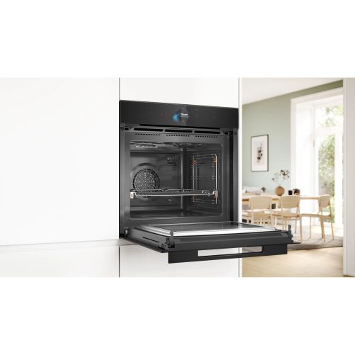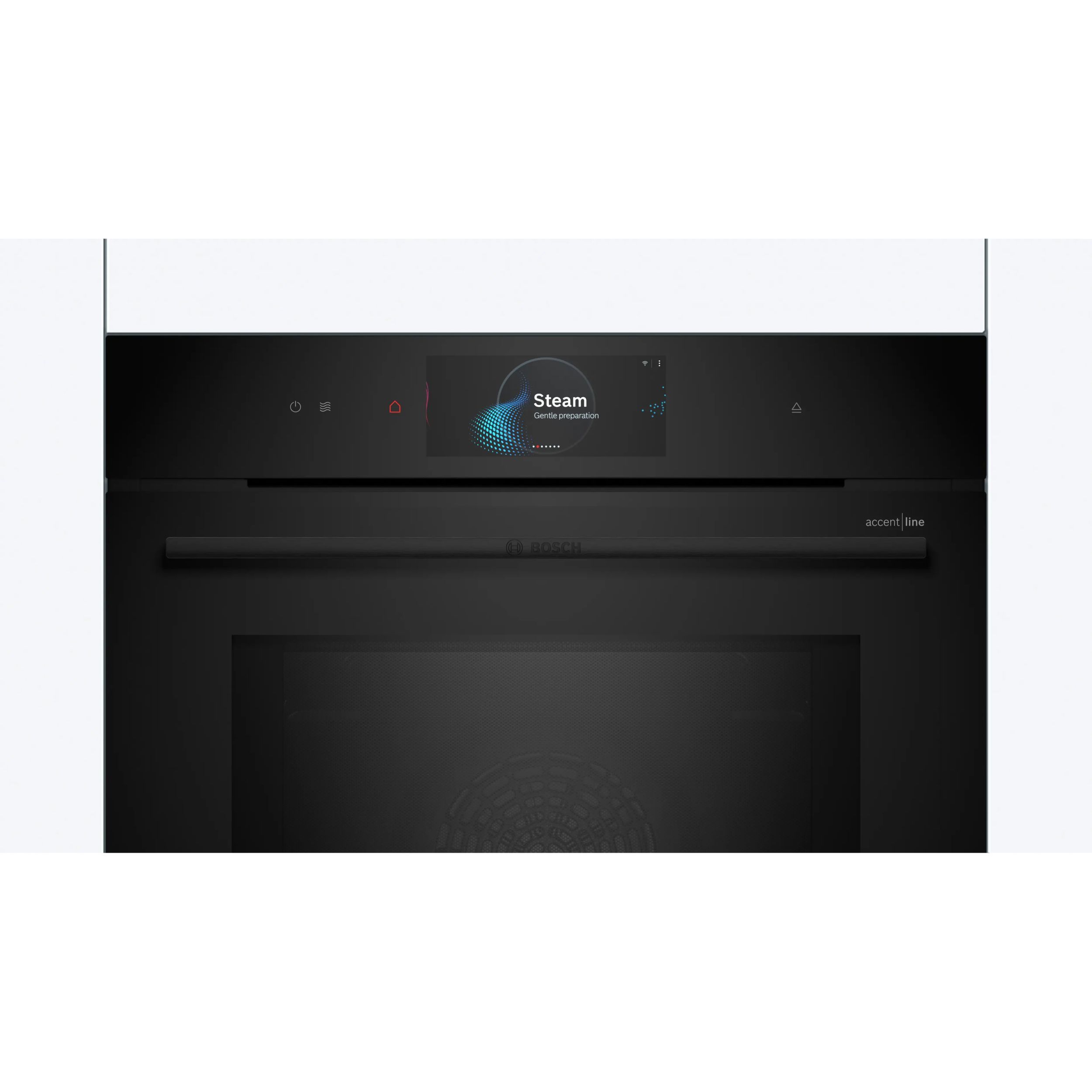 Cuptoarele Seria 8 din gama accent line sunt extrem de uşor de utilizat. Datorită finisajului lor complet negru, se potrivesc perfect cu orice mobilier de bucătărie, indiferent de stil. Iar inelul digital pentru comenzi este nu doar practic, ci şi conferă un plus de stil bucătăriei tale: acesta are un design minimalist atunci când este dezactivat şi se aprinde în culori calde atunci când este activat. De asemenea, navigarea în meniul cuptoarelor Seria 8 din gama accent line este extrem de simplă: poţi seta extrem de rapid şi uşor procesul de preparare şi temporizatorul direct pe afişajul tactil mare. Uşa cu geam fumuriu completează ingenios aspectul ultra-modern şi neted al cuptoarelor, iar tu poţi vedea în permanenţă preparatele din cuptor în timp ce acestea sunt gătite.