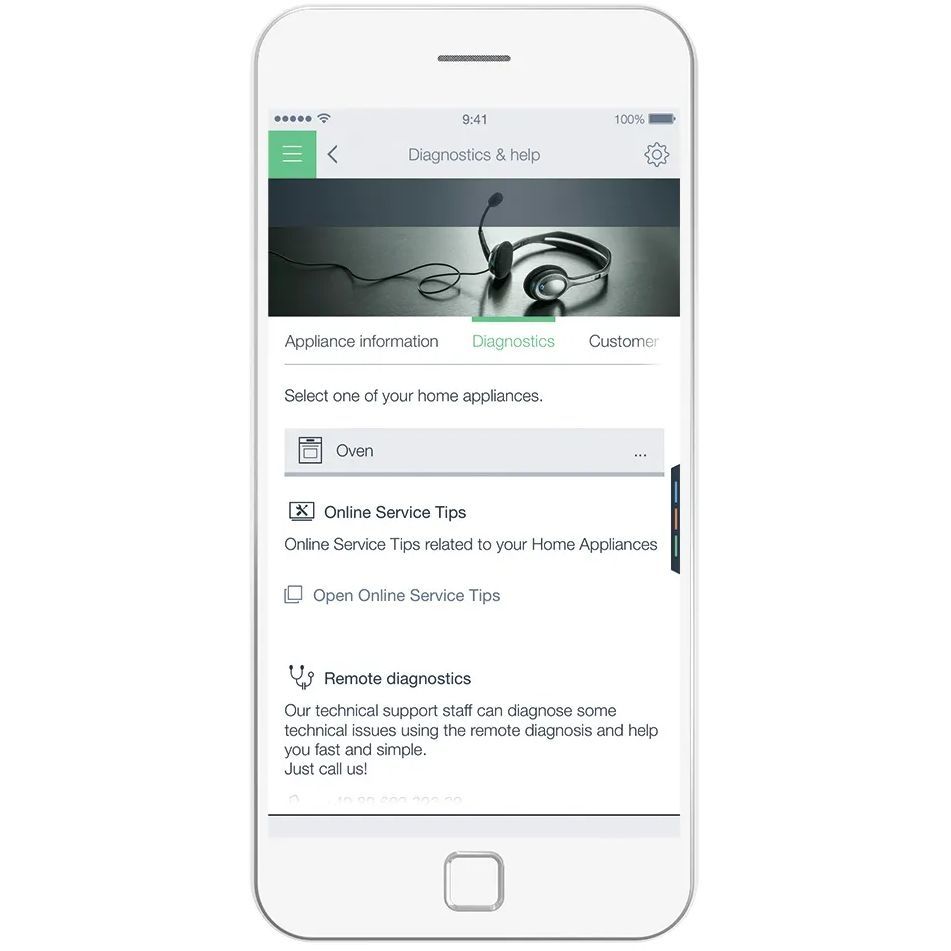 Remote Diagnostics: Ajutor acordat mai inteligent. Poate fi stresant dacă aparatele electrocasnice nu funcționează așa cum ar trebui. Remote Diagnostics este aici pentru a te ajuta. Sună la linia de asistență telefonică Home Connect și fă o programare pentru o diagnosticare la distanță a aparatelor electrocasnice conectate prin internet. Cu permisiunea ta, departamentul Bosch de asistență pentru clienți poate verifica de la distanță aparatul, poate identifica problema și îți poate oferi soluția de care ai nevoie. În cazul în care problema nu poate fi rezolvată în acest mod, poate fi informat un tehnician de service Bosch care să vină acasă la tine pentru a rezolva toate problemele, având la el toate piesele necesare. Suport inteligent, soluții inteligente - prin atingerea unui buton.