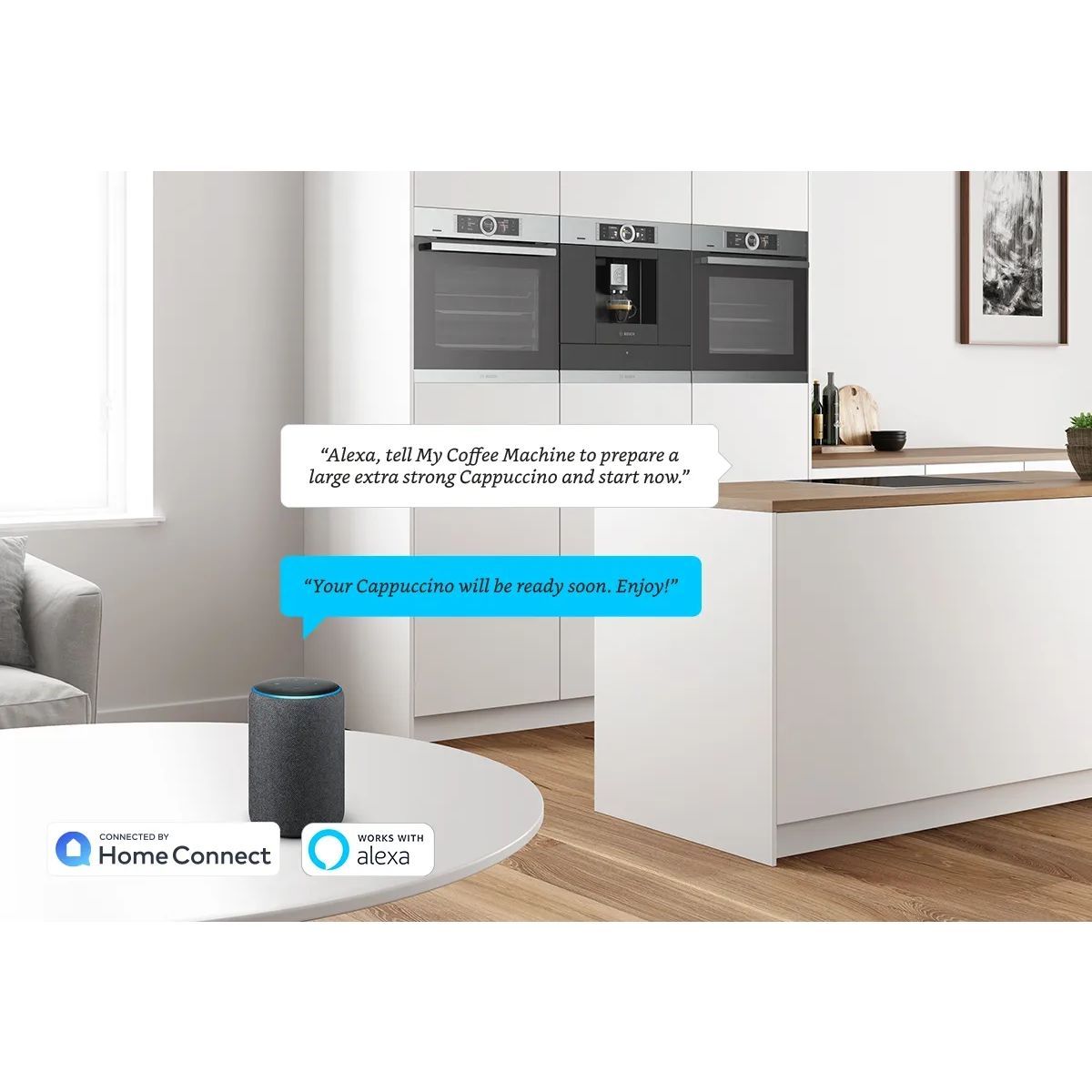 Control vocal - Folosește aparatul de la distanță cu Alexa de la Amazon prin intermediul controlului vocal. Datorită parteneriatului nostru cu Alexa de la Amazon aparatul tău de cafea ta poate fi controlat ușor cu ajutorul comenzilor vocale. Descarcă aplicația Home Connect* și fă setările corespunzătoare pentru a o conecta pe Alexa de la Amazon la espressorul tău. (*Modulul Alexa din aplicația „Home Connect” nu este disponibil pentru toate țările).