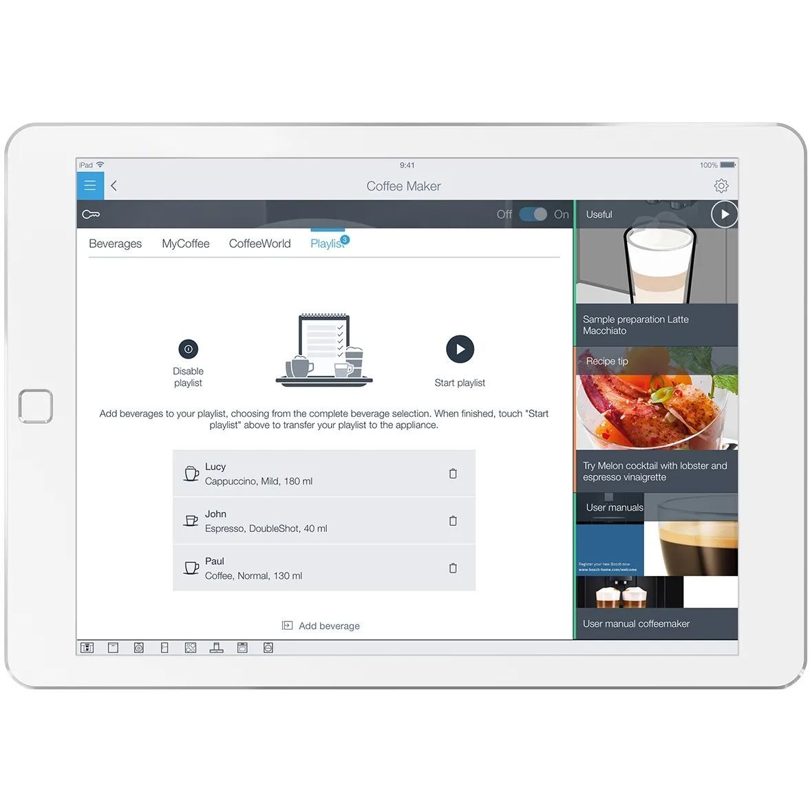 CoffeePlaylist: Introduceți simultan mai multe tipuri de băuturi în aplicație (de ex. pentru musafiri), iar aparatul va pregăti apoi băuturile una după alta.