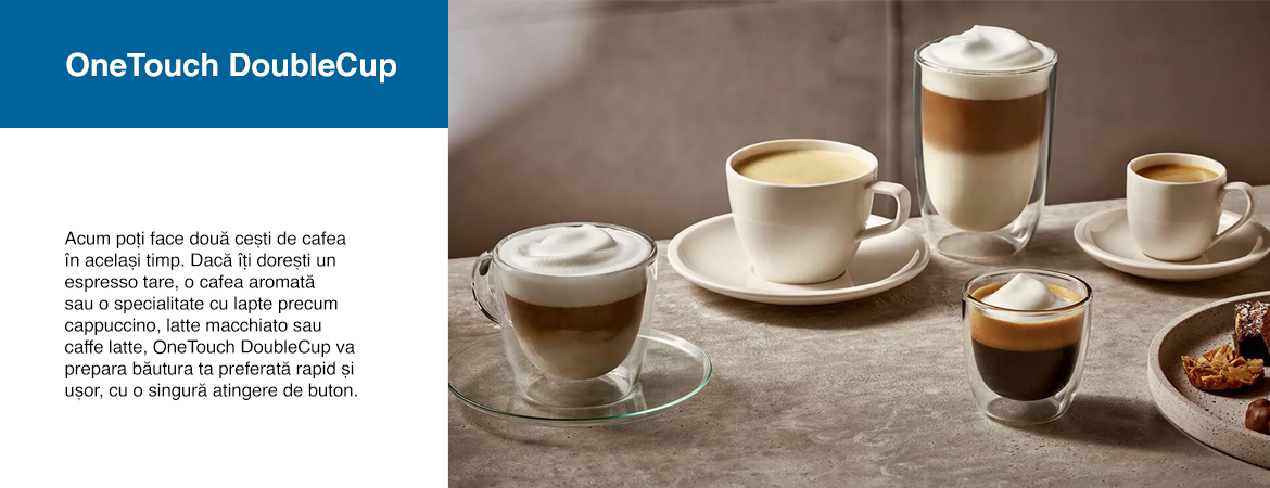 Acum poți face două cești de cafea în același timp. Dacă îți dorești un espresso tare, o cafea aromată sau o specialitate cu lapte precum cappuccino, latte macchiato sau caffe latte, OneTouch DoubleCup va prepara băutura ta preferată rapid și ușor, cu o singură atingere de buton.