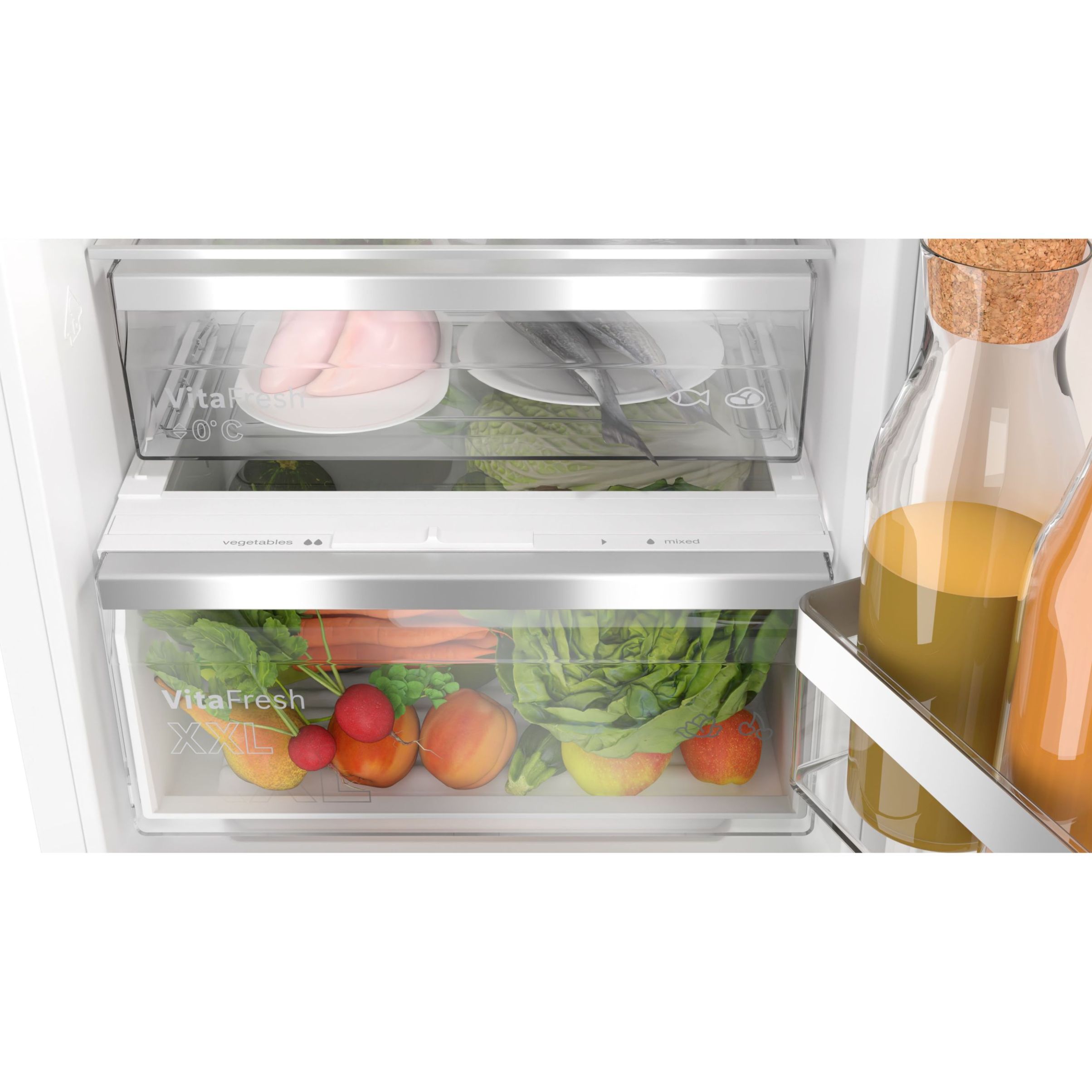 Combina frigorifică încorporabilă No Frost cu VitaFresh XXL <0°> și nivel constant de temperatură păstrează alimentele proaspete pentru mai mult timp. Toate produsele dumneavoastră sunt congelate fără gheață și vizibile datorită iluminării suplimentare a congelatorului.