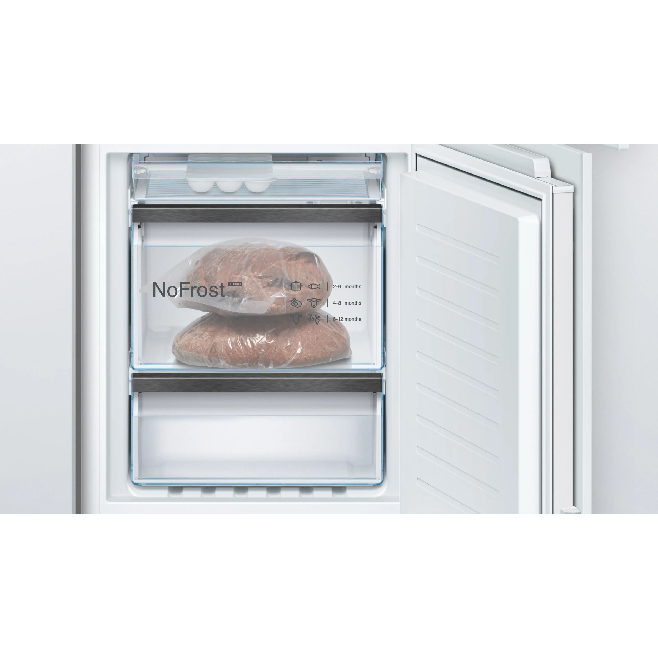 Circulația uniformă a aerului rece uscat în interiorul congelatorului previne formarea gheții. Ca urmare, nu se acumulează gheață nici pe peretele din spate, nici pe sertarele congelatorului. Astfel, No Frost oferă confort maxim, deoarece nu trebuie să mai dezgheți niciodată congelatorul.