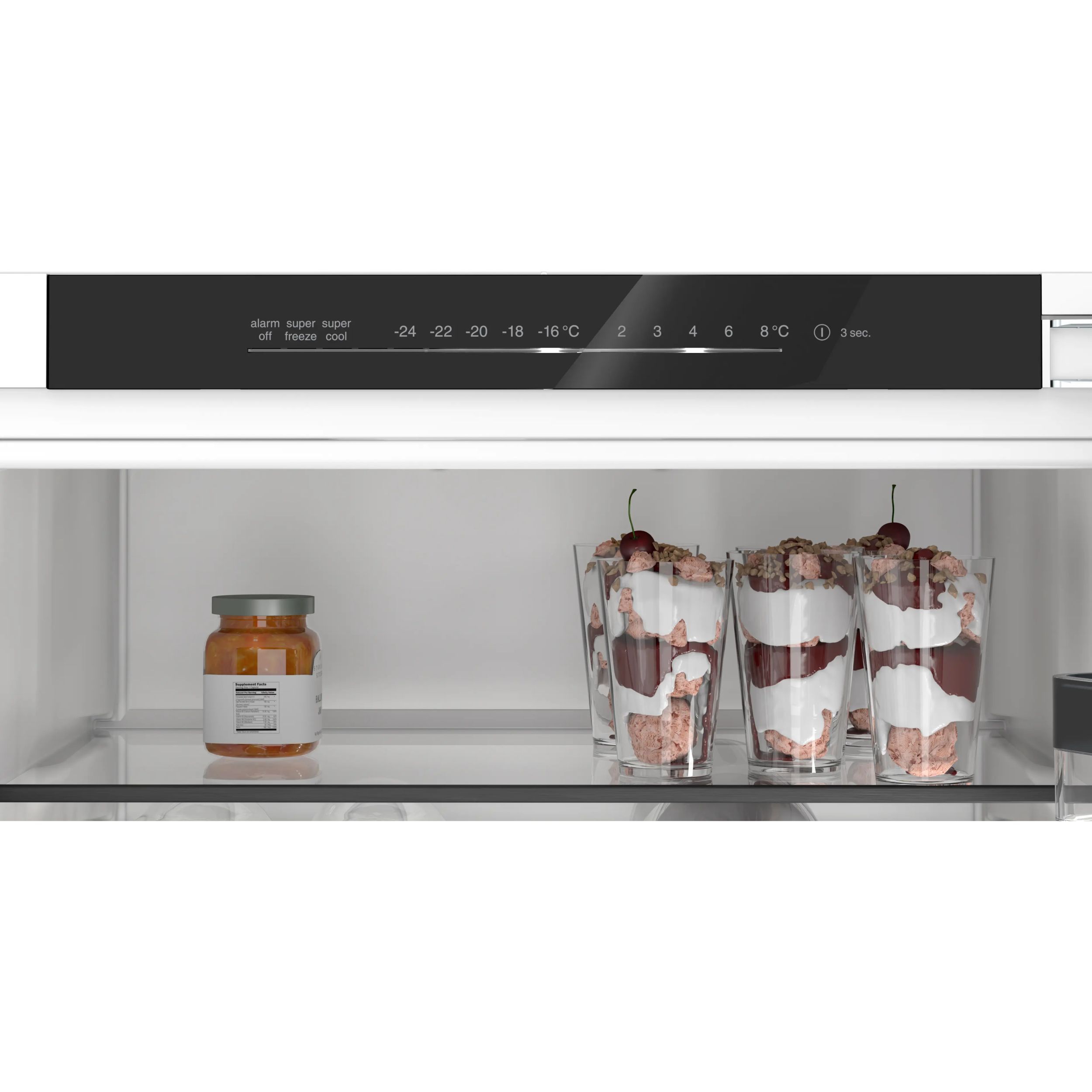 Cu funcția Super Cooling, poți reduce temporar temperatura din frigider înainte de a merge la cumpărături. Astfel, alimentele proaspăt achiziționate sunt păstrate la temperatura optimă. Este suficient să apeși un buton pentru a scădea temperatura cu până la 2°C. Iar pentru a evita consumul inutil de energie, funcția revine automat la setările normale după aproximativ 6-15 ore. În plus, dacă frigiderul tău este conectat, poți activa funcția Super Cooling direct din aplicația Home Connect.
