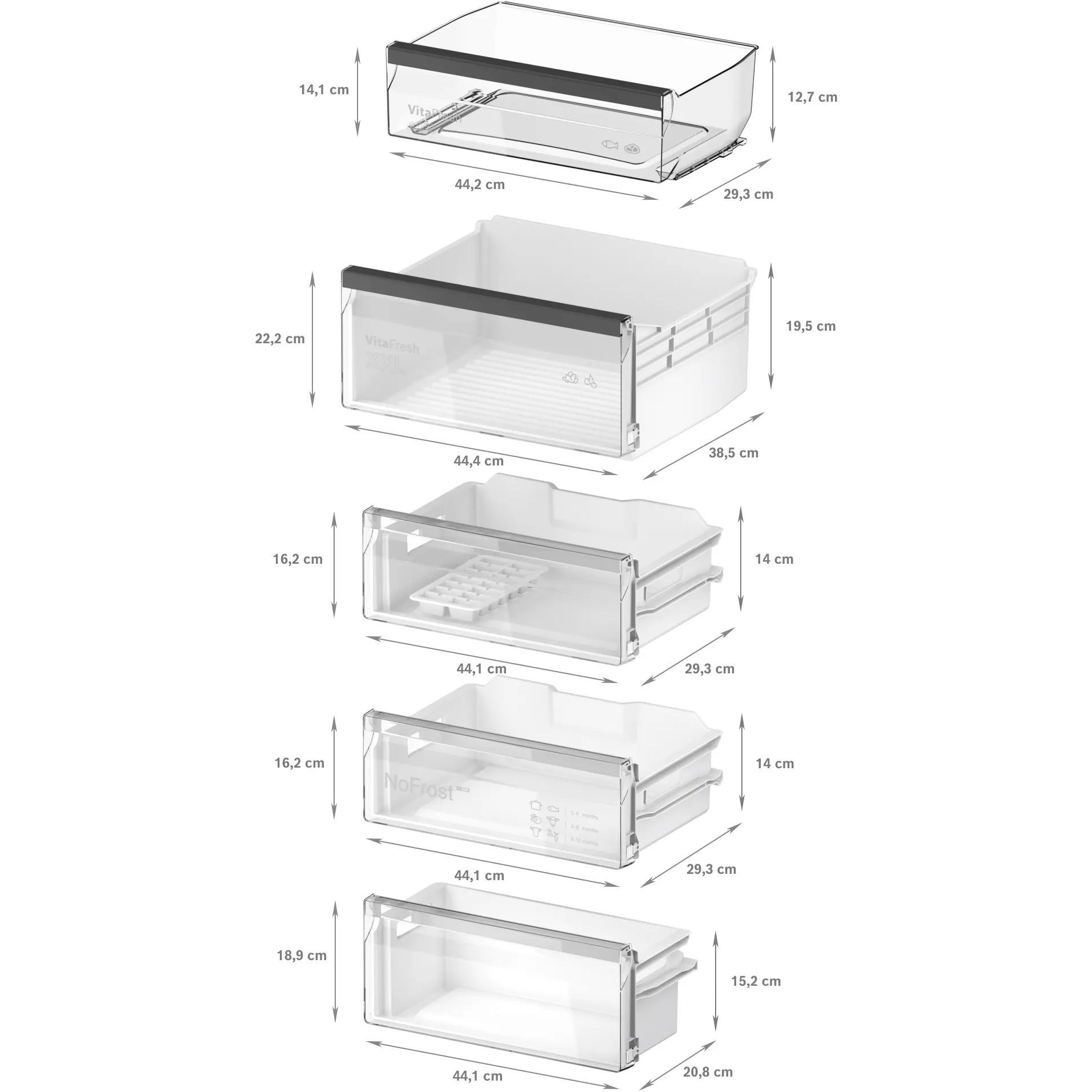 Circulația uniformă a aerului rece uscat în interiorul congelatorului previne formarea gheții. Ca urmare, nu se acumulează gheață nici pe peretele din spate, nici pe sertarele congelatorului. Astfel, No Frost oferă confort maxim, deoarece nu trebuie să mai dezgheți niciodată congelatorul.