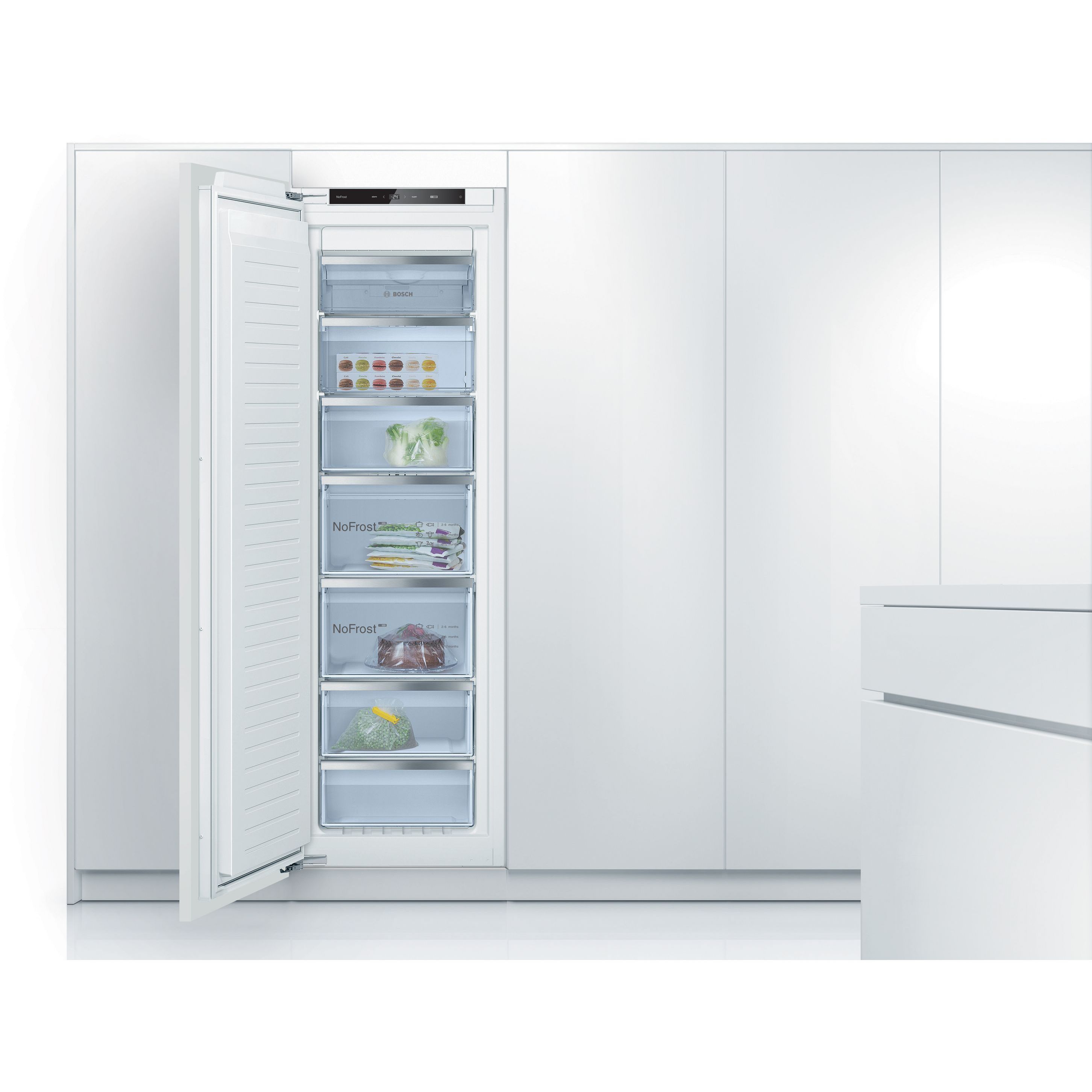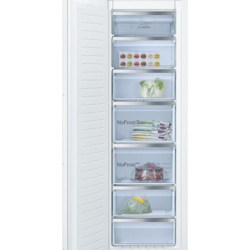 Circulația uniformă a aerului rece uscat în interiorul congelatorului previne formarea gheții. Ca urmare, nu se acumulează gheață nici pe peretele din spate, nici pe sertarele congelatorului. Astfel, No Frost oferă confort maxim, deoarece nu trebuie să mai dezgheți niciodată congelatorul.