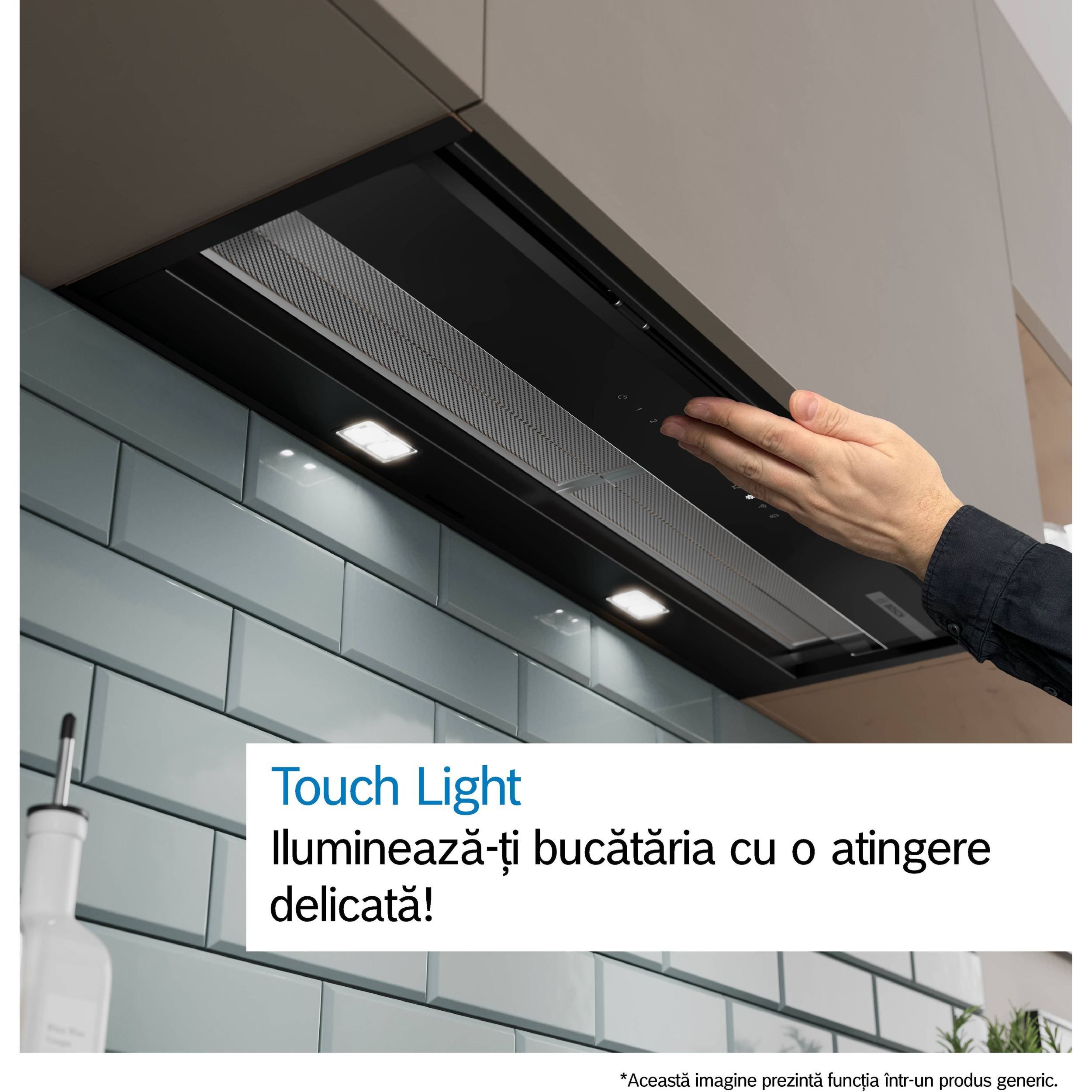 LED-urile montate pe hotă pot fi o sursă utilă de lumină chiar și atunci când nu gătești, fie pentru a crea o ambianță plăcută, fie pentru a evidenția plita ta elegantă. Datorită funcției Touch Light, nu trebuie să rabatezi panoul de sticlă pentru a aprinde sau stinge LED-urile. O simplă atingere a zonei de control este suficientă.