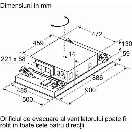 - Posibilitate de evacuare a aerului pe toate cele patru laturi ale hotei