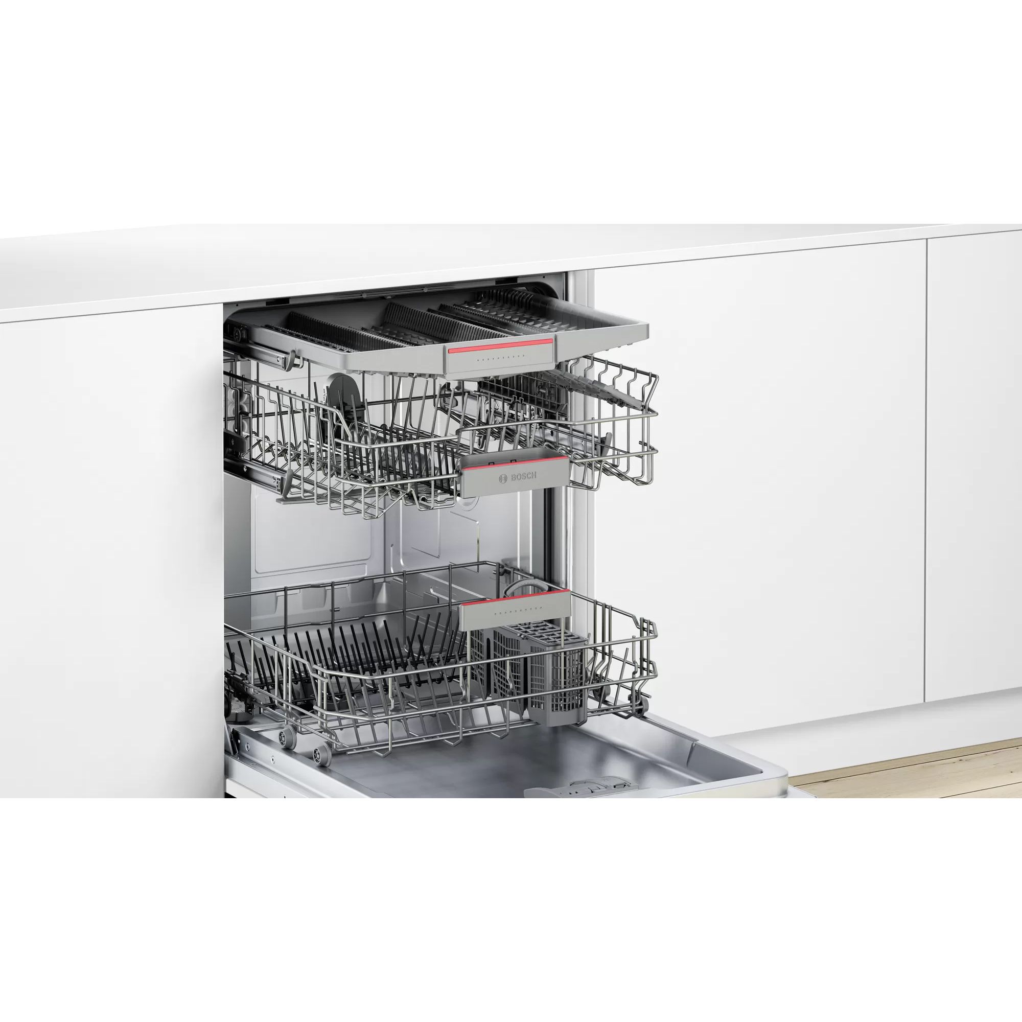 Datorită sertarului de tacâmuri VarioDrawer, cel de-al treilea nivel de încărcare, mașinile de spălat vase Bosch sunt și mai confortabile. Acesta este locul ideal pentru tacâmuri și ustensile mici de bucătărie, de exemplu polonice și teluri. Acesta îți oferă mai mare flexibilitate la încărcarea mașinii tale de spălat vase și creează mai mult spațiu în interiorul compartimentului de spălare. Coșul pentru tacâmuri din coșul inferior poate fi înlocuit cu VarioDrawer pentru crea o capacitate de până la 14 seturi de veselă standard în cazul mașinilor de spălat vase de 60 cm, și de până la 10 seturi de veselă standard pentru mașinile de 45 cm.
