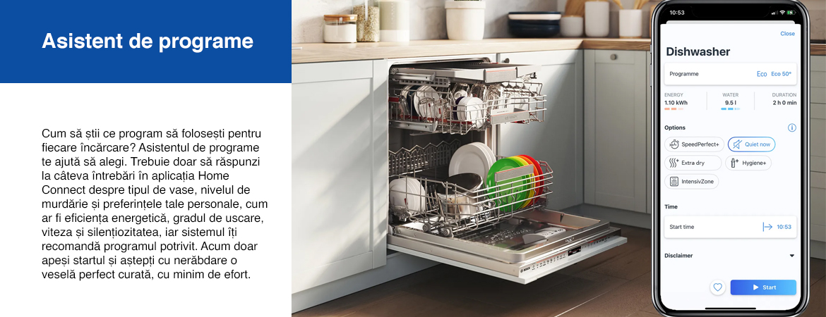 Cum să știi ce program să folosești pentru fiecare încărcare? Asistentul de programe te ajută să alegi. Trebuie doar să răspunzi la câteva întrebări în aplicația Home Connect despre tipul de vase, nivelul de murdărie și preferințele tale personale, cum ar fi eficiența energetică, gradul de uscare, viteza și silențiozitatea, iar sistemul îți recomandă programul potrivit.A,cum doar apeși startul și aștepți cu nerăbdare o veselă perfect curată, cu minim de efort.