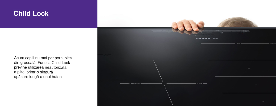 Acum copiii nu mai pot porni plita din greșeală. Funcția Child Lock previne utilizarea neautorizată a plitei printr-o singură apăsare lungă a unui buton.