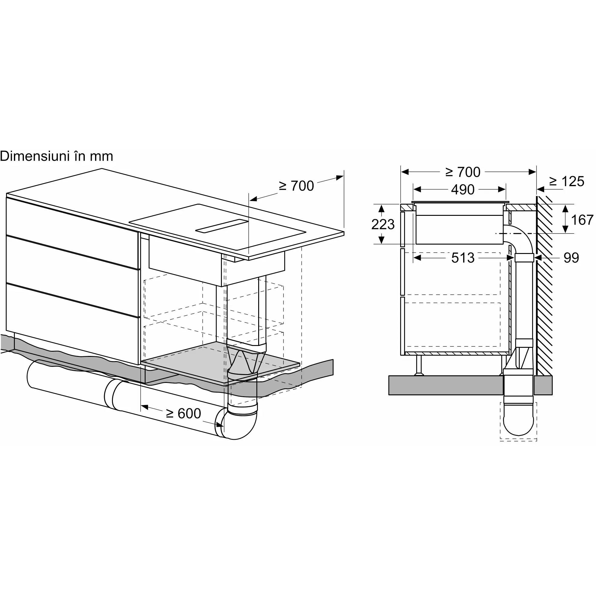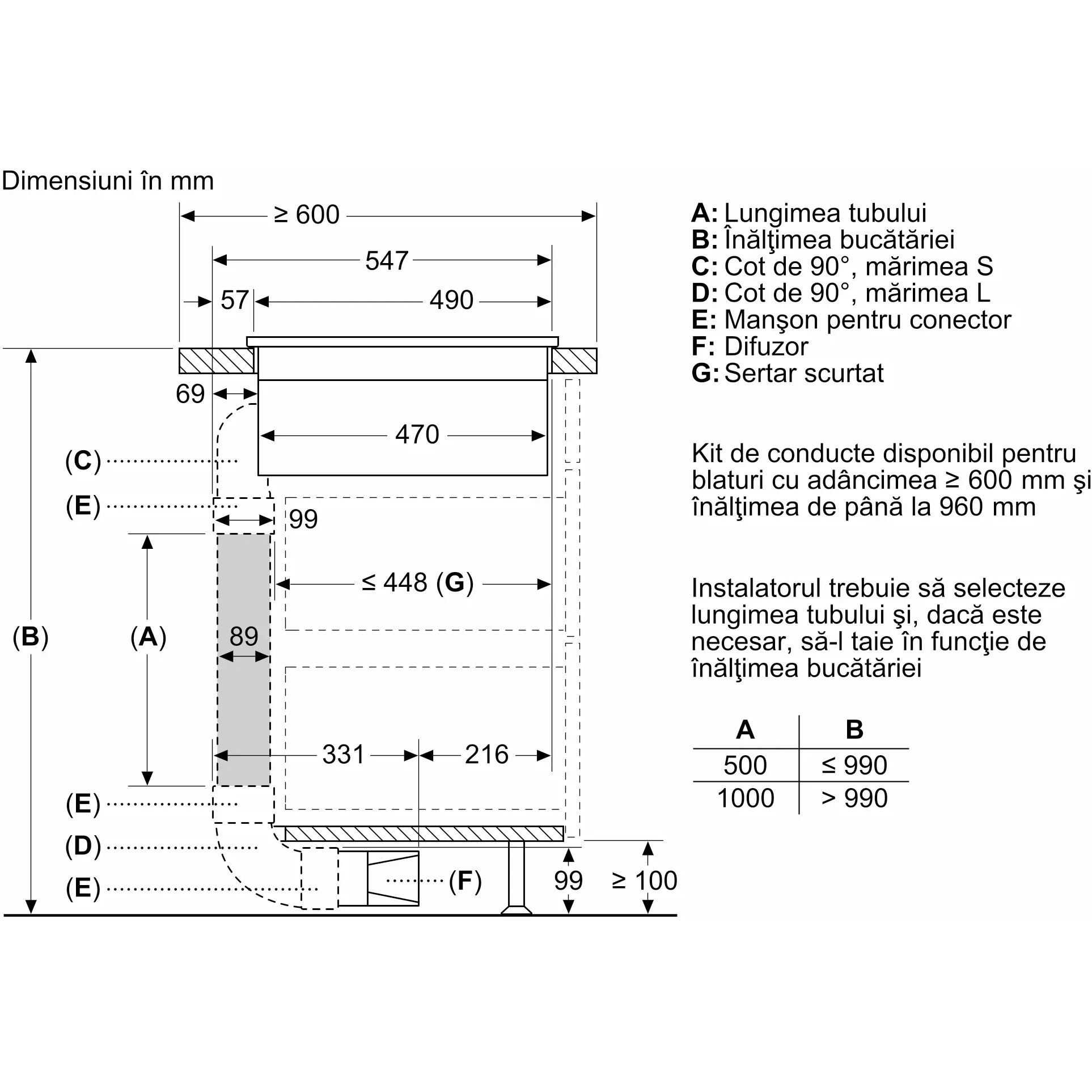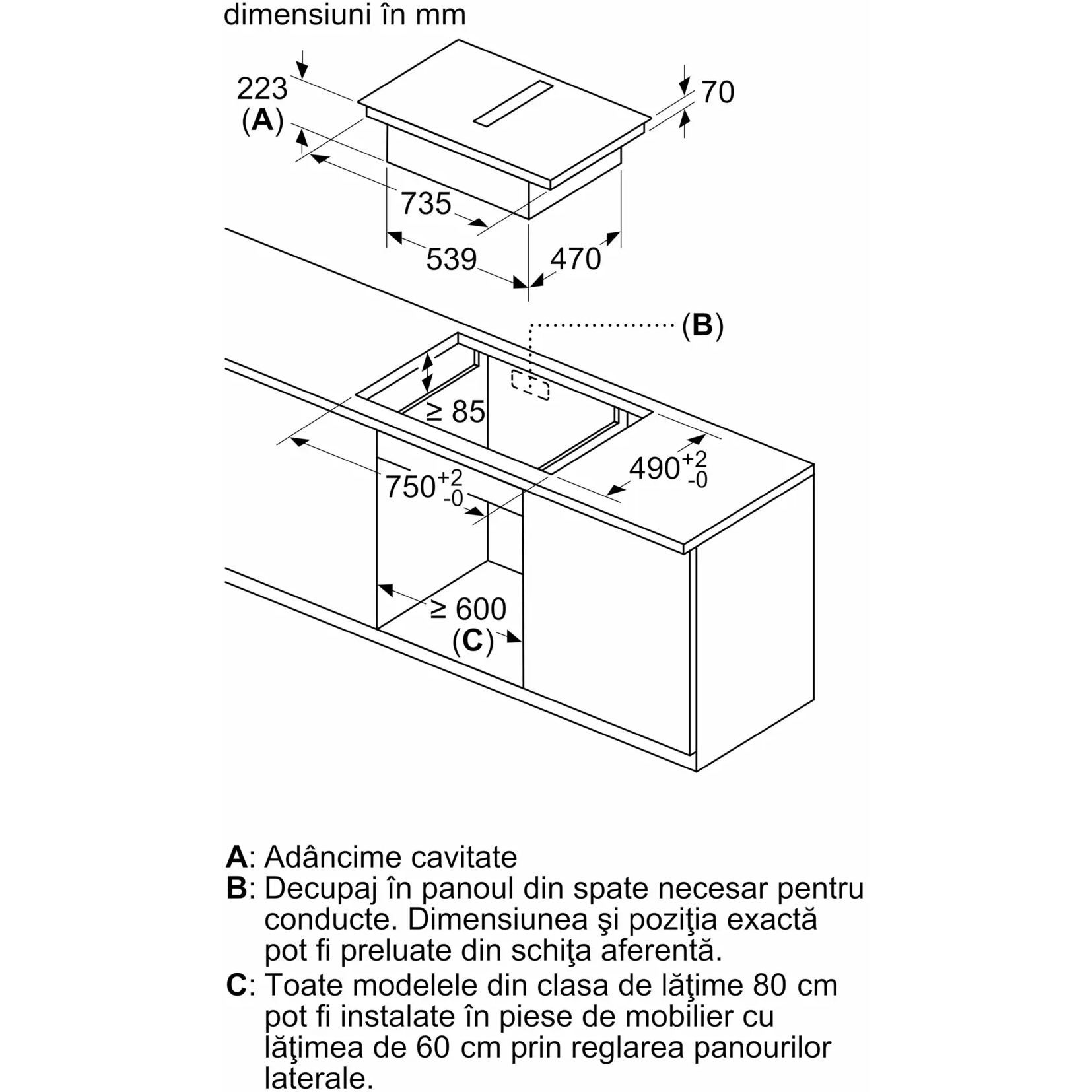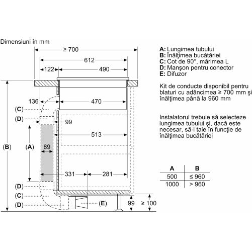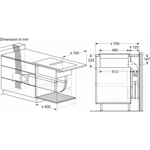 - - Nu este necesară o podea falsă sub plita cu sistem de ventilare integrat. Sertarele și/sau rafturile din dulap trebuie să fie detașabile. Panoul din spatele dulapului poate fi păstrat, însă o decupare este necesară pentru duza de aer (pozitionarea și dimensiunea se regăsesc în instrucțiunile de instalare).