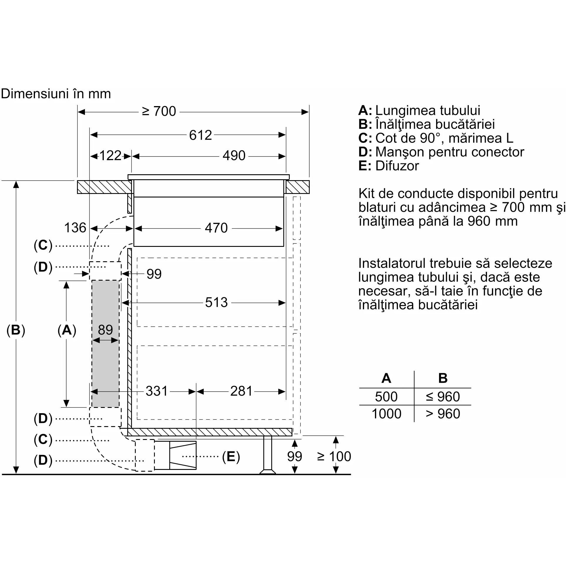 - - Pentru instalarea în regim recirculare cu tubulatură parțială sau fără tubulatură, trebuie să se respecte o deschidere de retur de ≥400cm² în zona plintei. Deschiderea poate fi realizată prin intermediul grilelor de evacuare, grilelor cu lamele sau a plintelor decupate subtil, în funcție de tipul mobilierului de bucătărie.