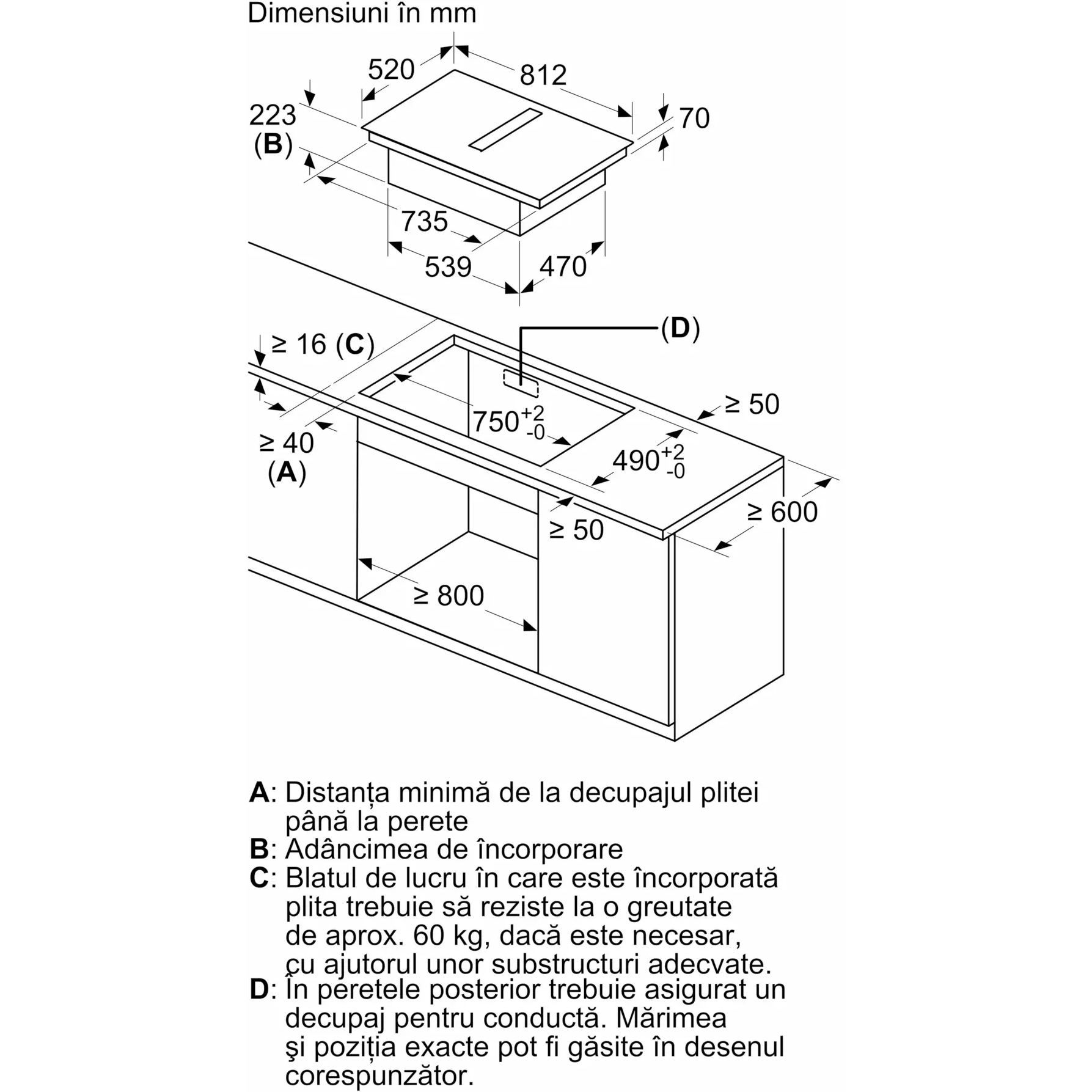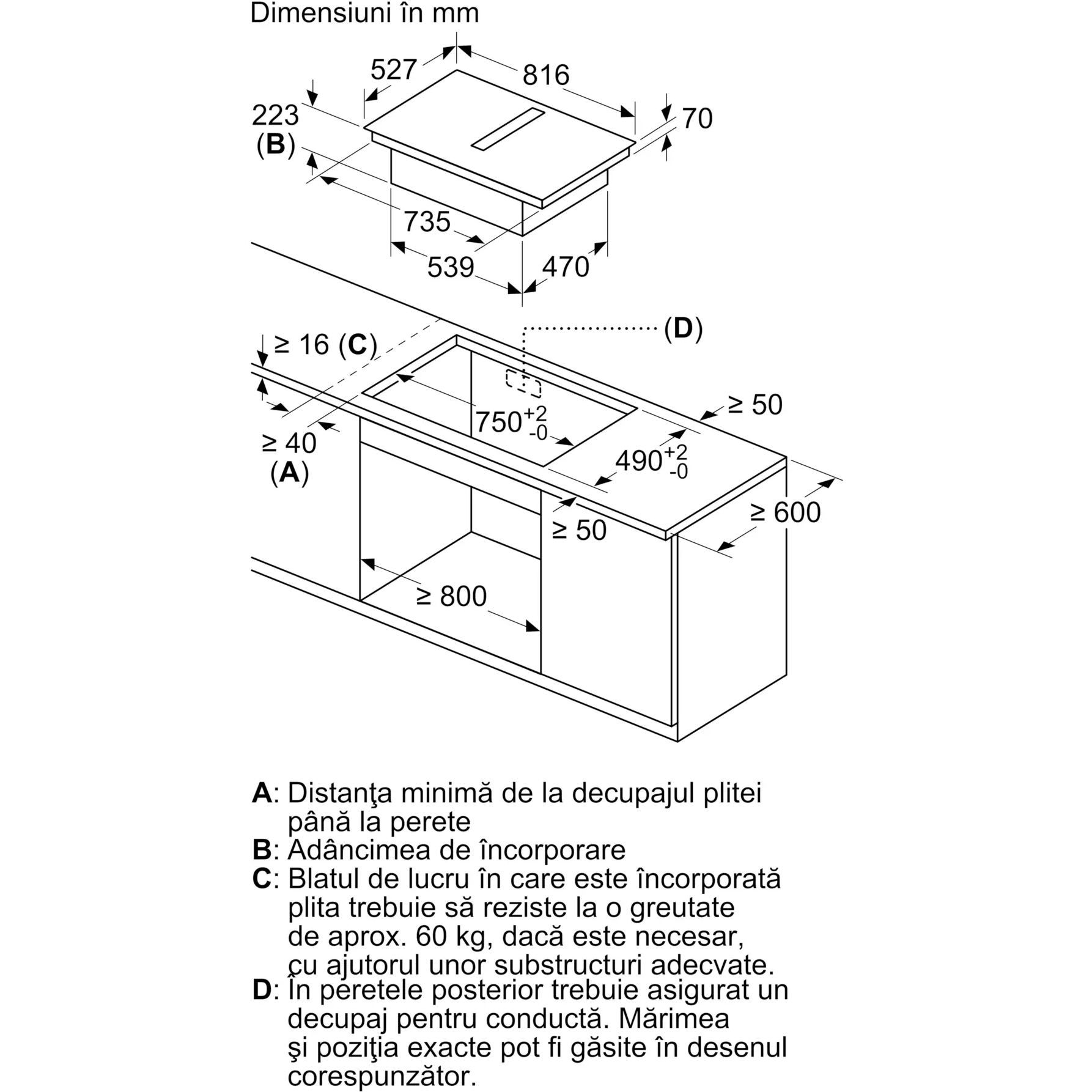 - - Greutatea totală a aparatului este de 26 kg - în special în cazul blaturilor de lucru foarte subțiri, capacitatea portantă și stabilitatea trebuie să fie asigurate folosind substructuri adecvate. Greutatea generală a aparatului și specificațiile de integritate structurală ale producătorului blatului de lucru trebuie să fie luate în considerare.
