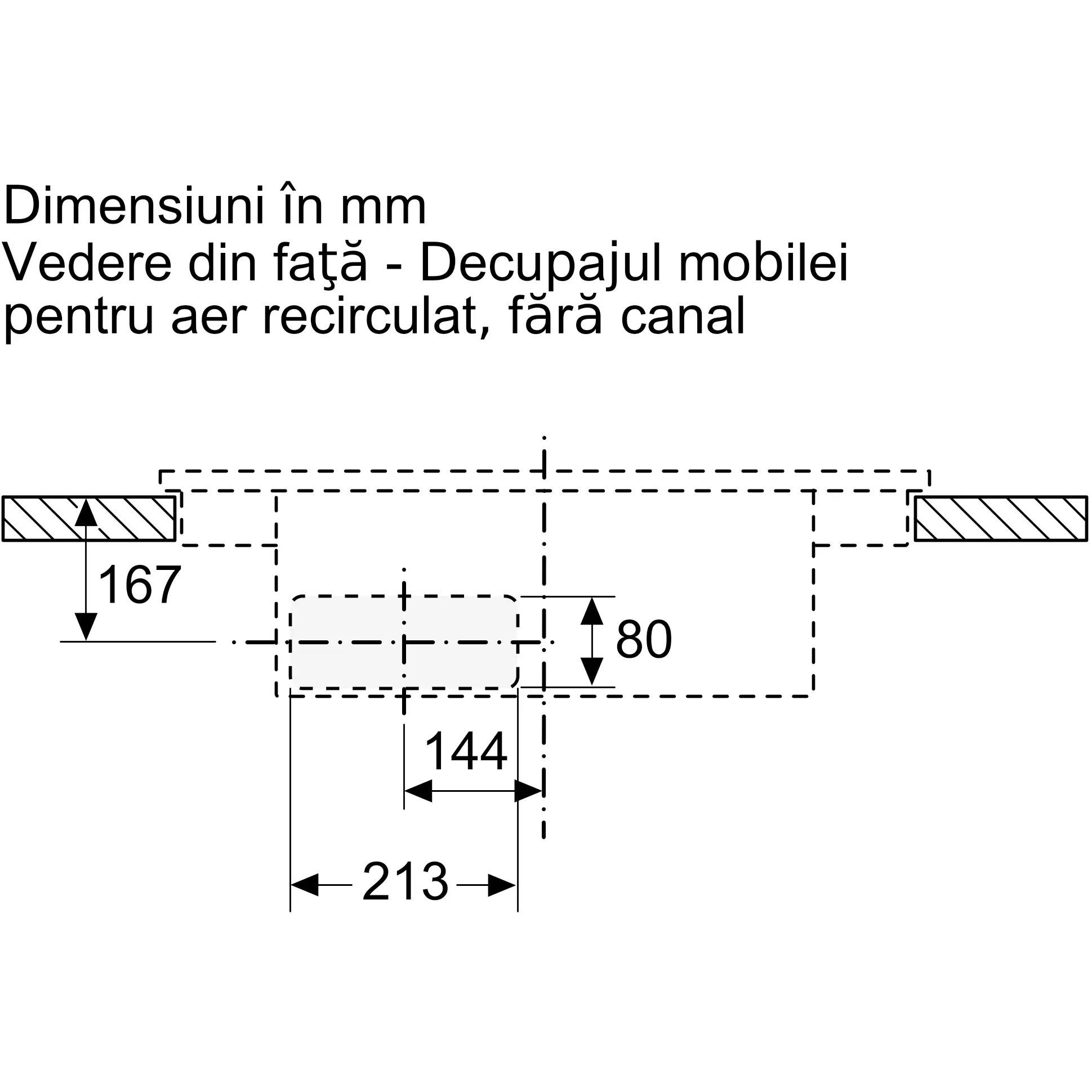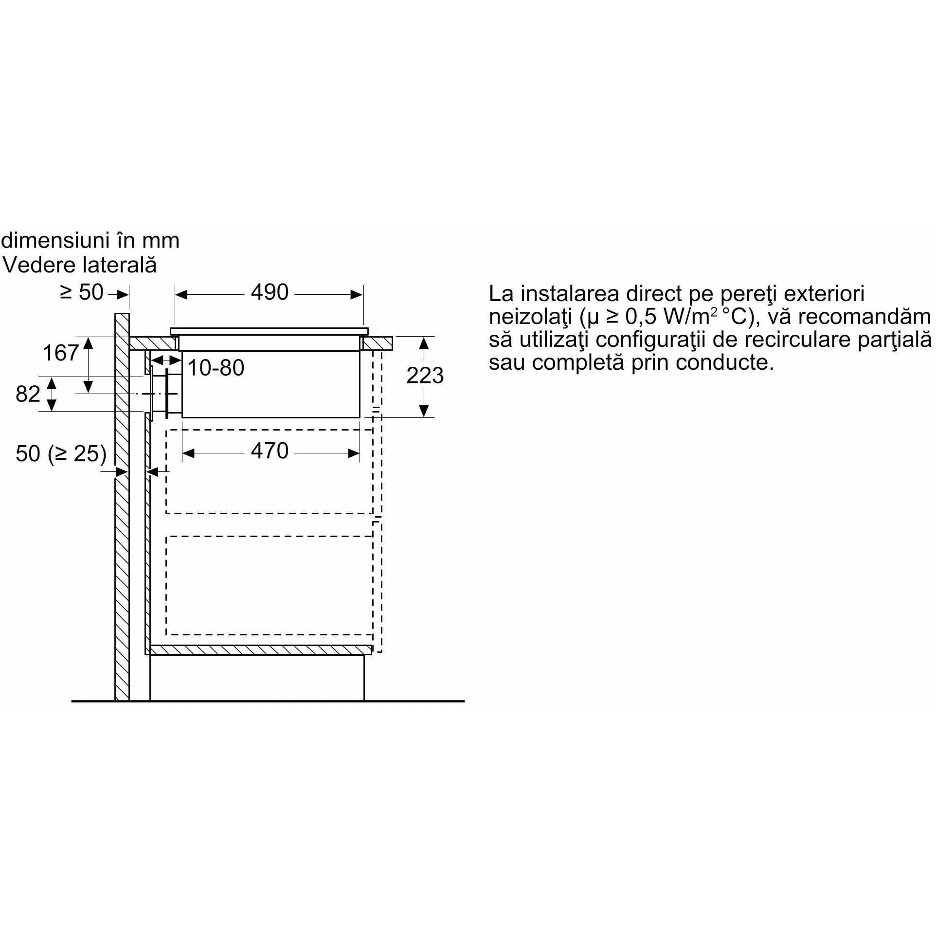 - - Instalarea în regim recirculare fără tubulatură necesită o deschidere verticală de minimum 25mm în panoul din spate al mobilei. Pentru o performanță ideală se sugerează 50mm.