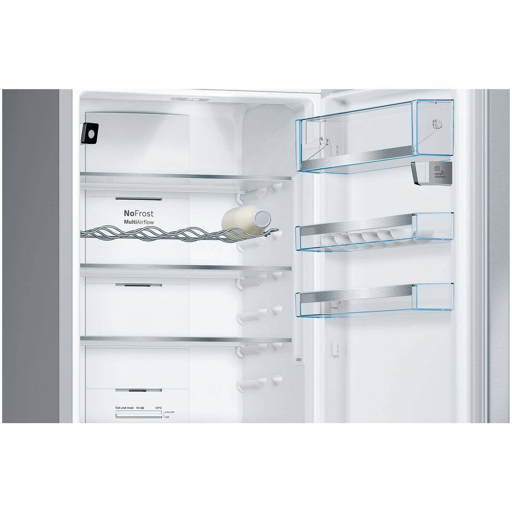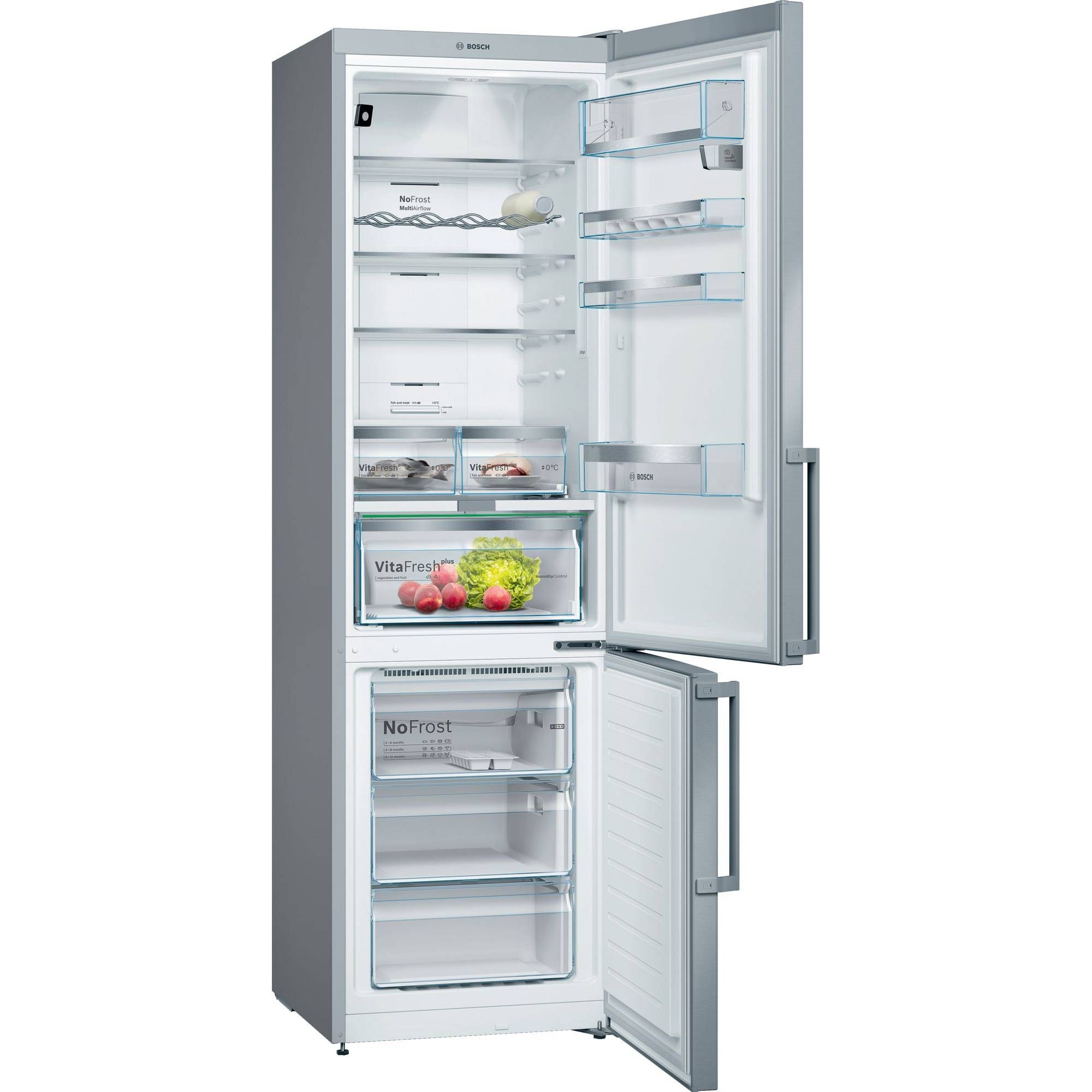 Sistem Multi Airflow: distribuție uniformă a aerului pentru o prospețime de lungă durată. Sistemul MultiAirflow asistat de ventilator produce curenți de aer rece uniformi la nivelul zonelor de răcire și congelare. Fluctuațiile de temperatură sunt minimizate, iar timpul de răcire este redus, ceea ce ajută alimentele să-și păstreze aroma mai mult timp. Bucurați-vă de prospețime de sus până jos