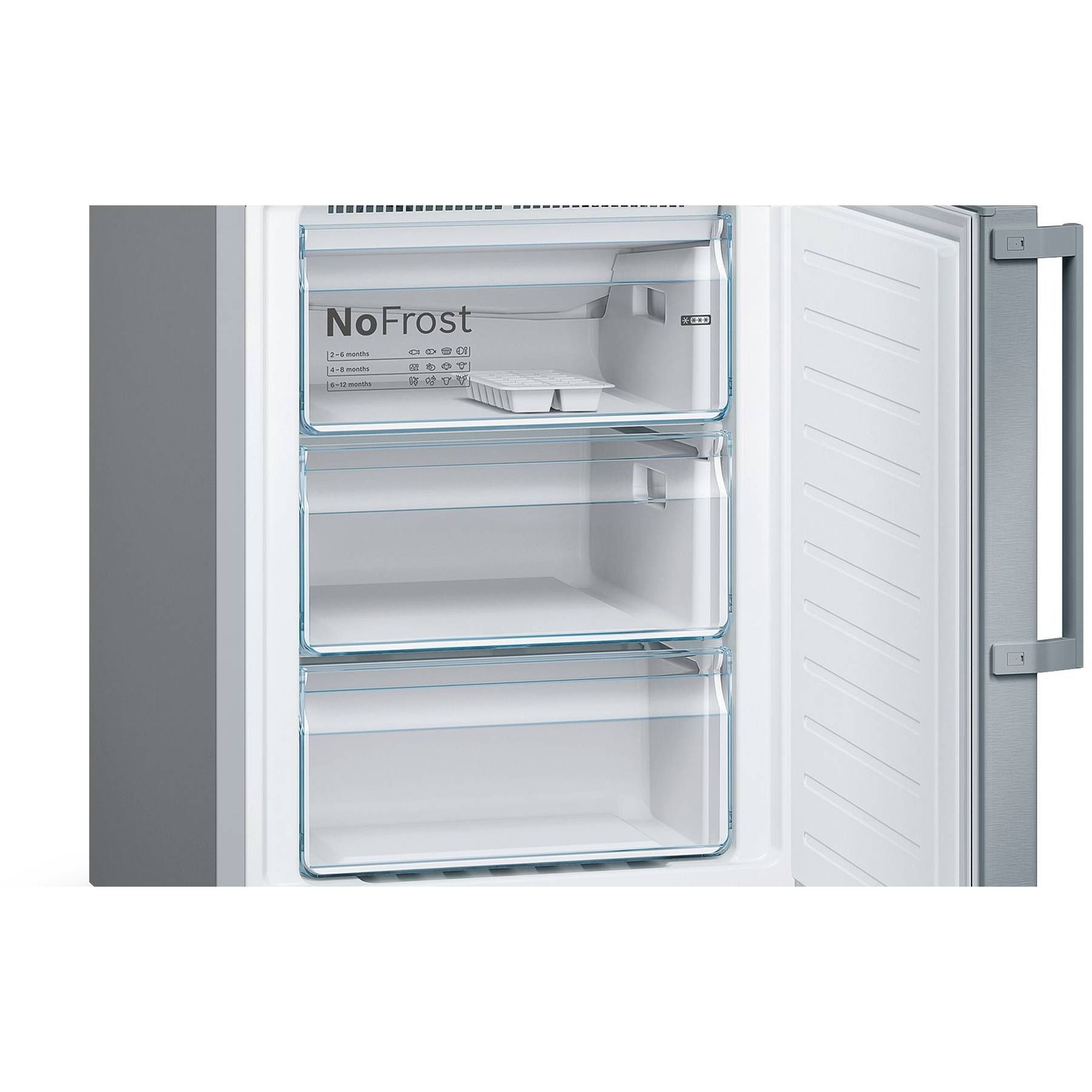 Sertare organizate în congelator. Un sistem ingenios de sertare în congelator pe 3 nivele creează spațiu de depozitare suplimentar pentru alimente congelate, de la cutii pentru pizza la vafe congelate. Noul sistem organizat de aranjare a rafturilor, la care se adaugă iluminarea cu LED, prezintă cu claritate toate produsele din congelator, astfel încât alimentele să nu rămână uitate.
