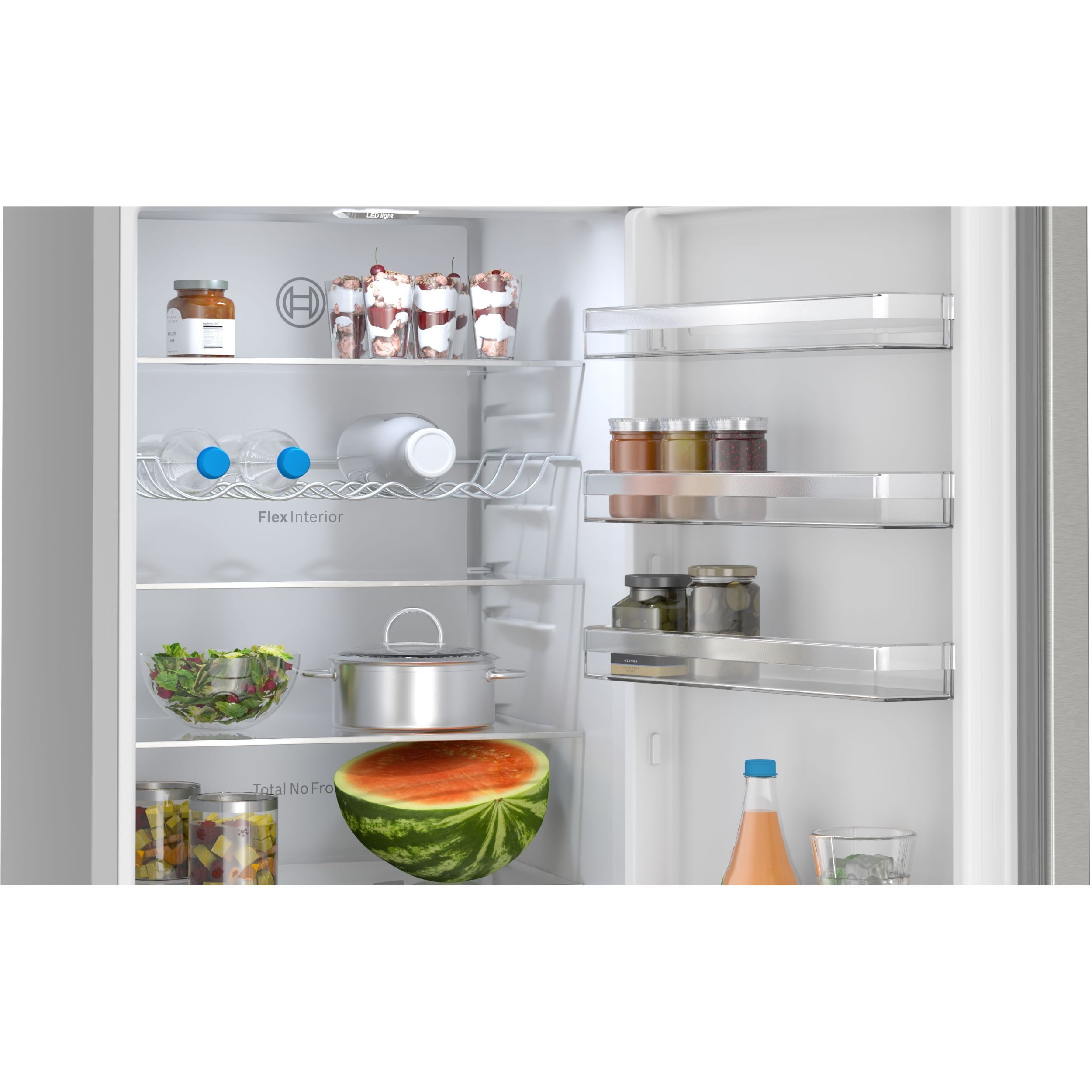 Cu Total No Frost, congelatorul tău nu va mai avea nevoie de dezghețare. Aceasta extrage umiditatea și menține aerul uscat, prevenind formarea gheții pe pereți și alimente. Același principiu se aplică și zonei frigiderului. Spune adio picăturilor de apă și acumulării de gheață pe peretele din spate, pentru un aspect igienic. Mai puțin efort de curățare și dezghețare, mai multă eficiență energetică.