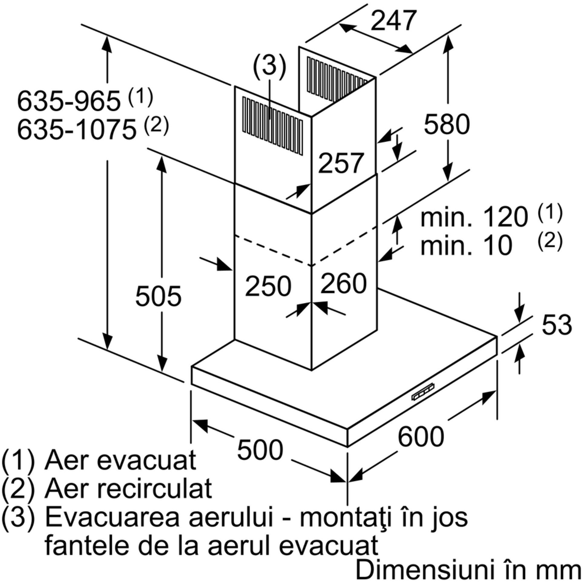 Dimensiuni pentru montaj ȋn mod evacuare (ÎxLxA): 635-965 x 600 x 500 mm