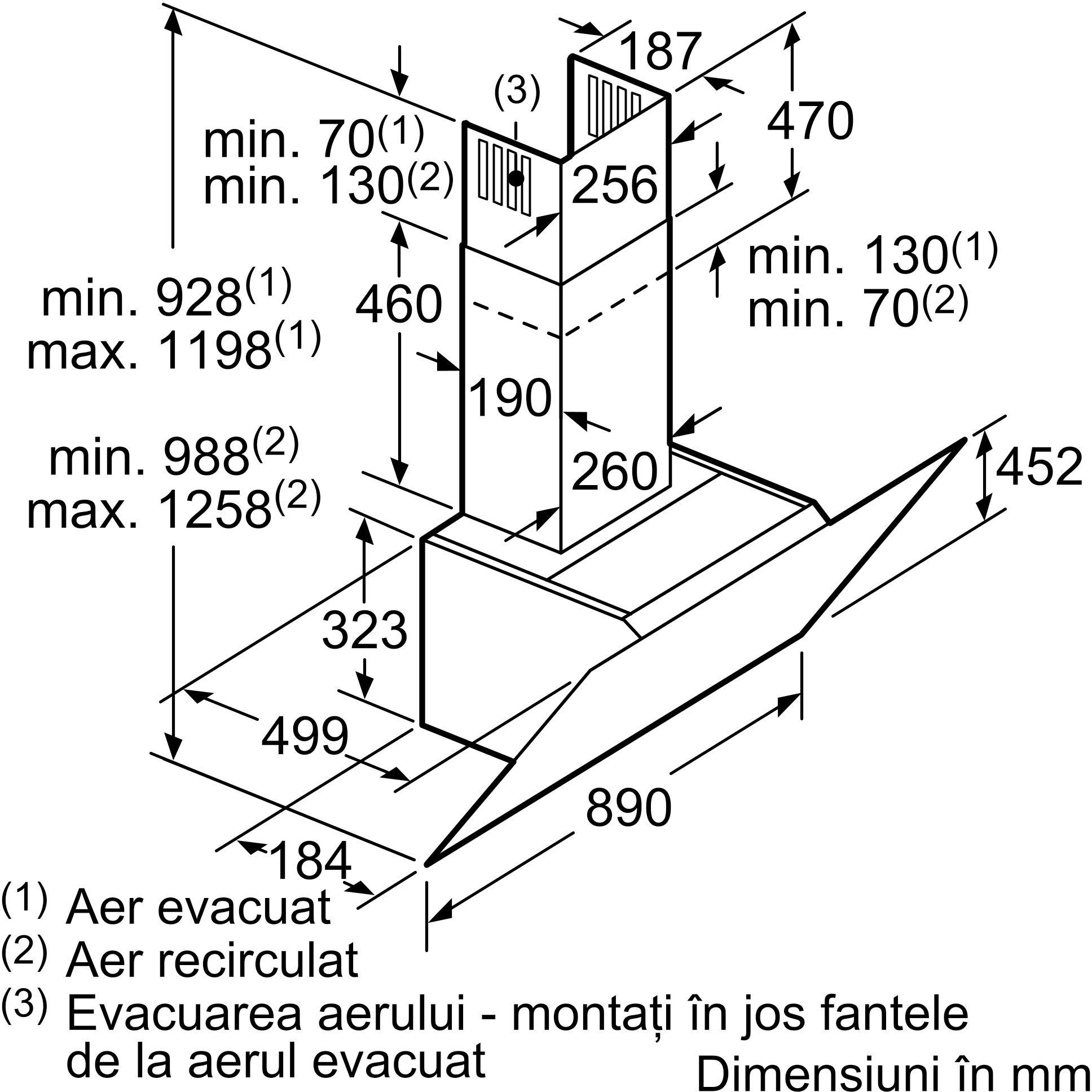 Dimensiuni hotă pentru montaj în mod recirculare (ÎxLxA): 988-1258 x 890 x 499mm